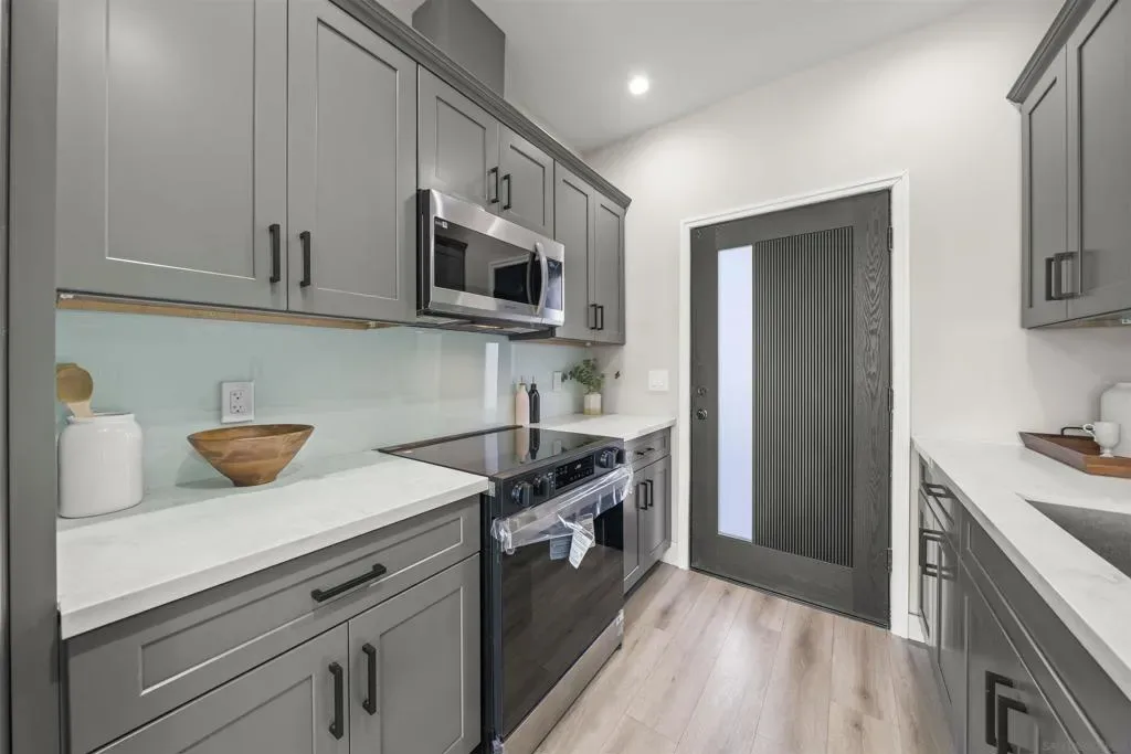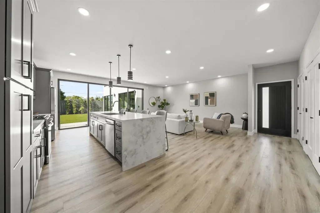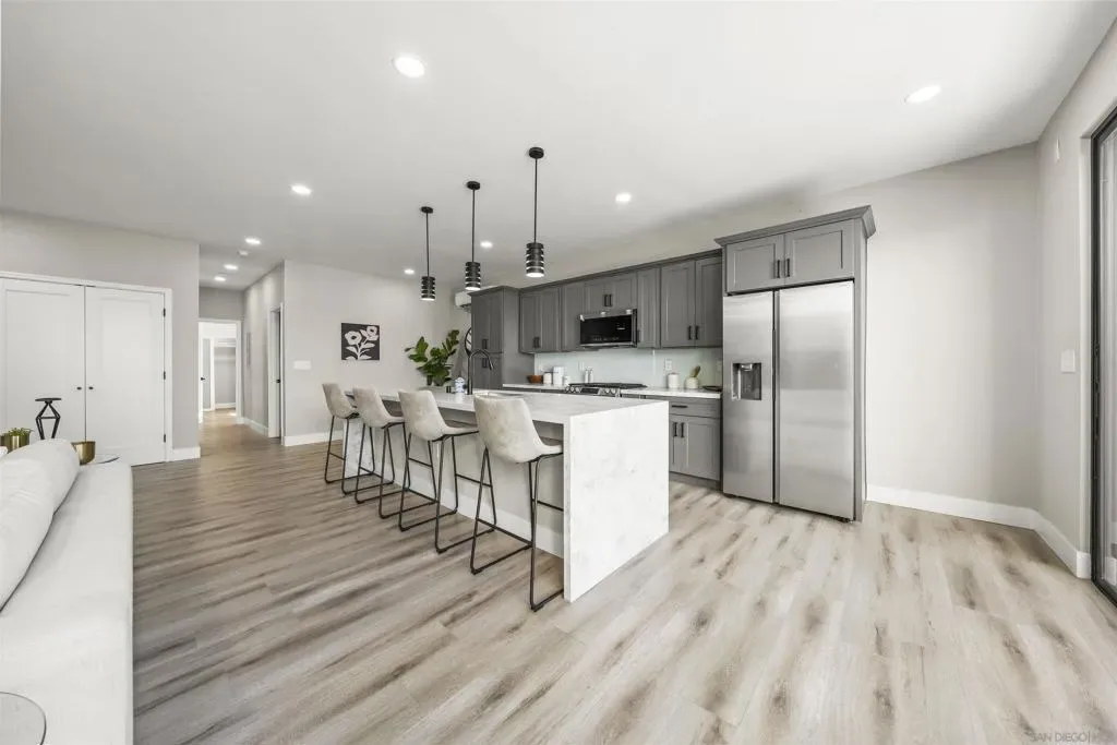 Welcome to this stunning NEW CONSTRUCTION single-story home with attached ADU that has separate entrances. PERMITS WERE OBTAINED. All bedrooms are primary suites and ceiling height is 9 feet all around. All new windows, multi-slide doors, stainless-steel appliances, custom quartz countertops throughout, kitchen island, contemporary front doors, custom garage door, roof top decks with lighting including stairs, new mini splits AC system in each unit, tankless water heater, walk in closet in primary ADU, dual closets in other bedrooms, new landscaping and patio areas, water and scratch resistant vinyl flooring throughout, bathrooms are custom tiled showers, vanities, with all new fixtures. Both units have open floorplan which flows into the living area, kitchen, and patio areas upon entry. New electrical, sewage, and plumbing. The roofs were done with westcoat water proofing and TPO both include 20-year warranty. Both units were framed in with the option to build up at a later time; the existing property was taken down to 3 walls. Separate SDG&E meters.