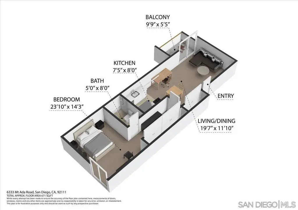 - Located in the Clairemont subdivision, 6333 Mount Ada Rd #279 San Diego CA is a Condo for sale in San Diego, CA, 92111. It is listed for $385,000 and features 1 beds, 1 baths, and has approximately 584 square feet of living space, and was originally constructed in 1972. The current price per square foot is $659. The average price per square foot for Condo listings in San Diego is $685. The average listing price for Condo in San Diego is $756,676. To schedule a showing of MLS#2600435sd at 6333 Mount Ada Rd #279 in San Diego, CA, contact your James Outland agent at 8057482262.