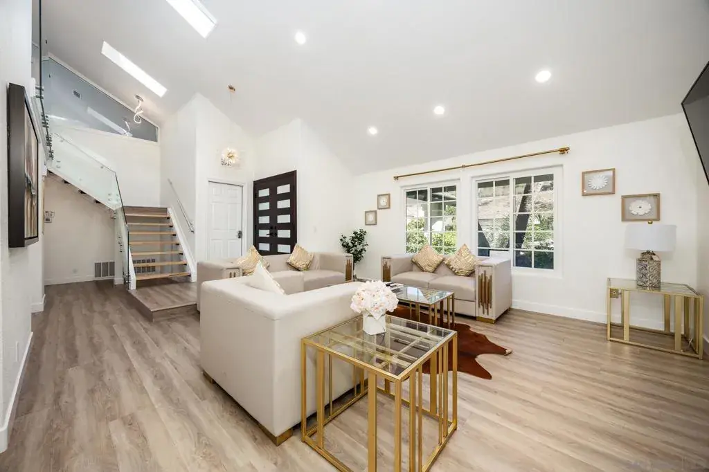 Welcome to this exceptional Del Cerro residence, a stunning two-story pool home offering panoramic west-facing canyon views and unforgettable sunsets. Designed for both luxury and flexibility, this 3-bedroom, 3.5-bath home includes a versatile flex 4th optional bedroom perfect for a home office, guest room, or nursery. The thoughtfully designed layout features three primary suites with full bathrooms, including one conveniently located on the ground floor—ideal for multigenerational living or guests. See supp… Upon entry, soaring vaulted ceilings in the living room create a dramatic first impression, complemented by abundant natural light, skylights, and designer lighting throughout. A custom glass-enclosed staircase adds a modern architectural statement. Entertain effortlessly with a formal living room, family room, formal dining room, and an additional casual dining area. The chef’s kitchen boasts quartz countertops, a large island, and extensive cabinet space, flowing seamlessly into the main living areas. Vinyl plank flooring runs throughout the home, adding warmth and durability. Upstairs, two primary suites open to a massive private balcony overlooking the pool and canyon views. The main upstairs primary retreat features a walk-in closet, double sinks, a floating vanity, barn door, and a spa-inspired shower with a waterfall showerhead. All bathrooms showcase custom tile work for a refined finish. The outdoor space is equally impressive, featuring a Trex deck, built-in grill, vinyl fencing, mature fruit trees, and palm trees in both the front and back yards—perfect for relaxing or entertaining. Additional highlights include a tile roof, solar, RV parking, turf landscaping in the front yard, a dedicated laundry room, double front doors, and a two-car garage. This light-filled Del Cerro home combines modern design, flexible living, and resort-style outdoor amenities in one of San Diego’s most desirable neighborhoods.