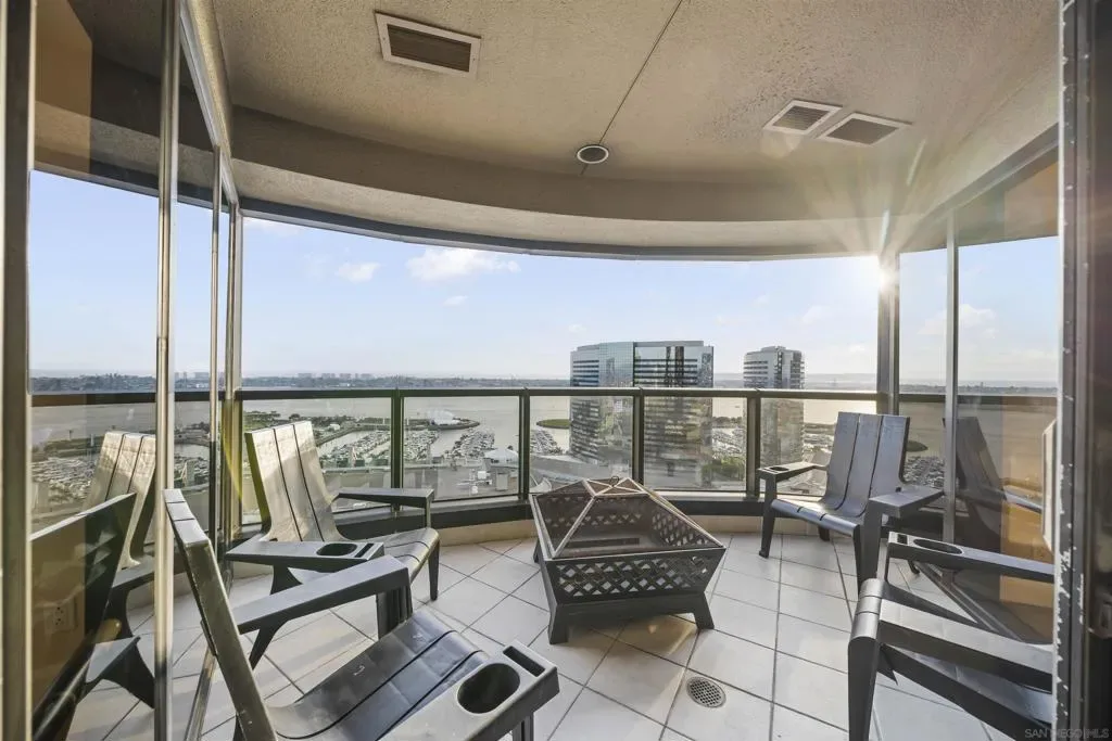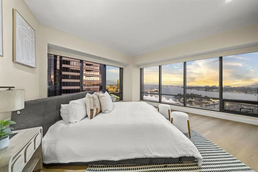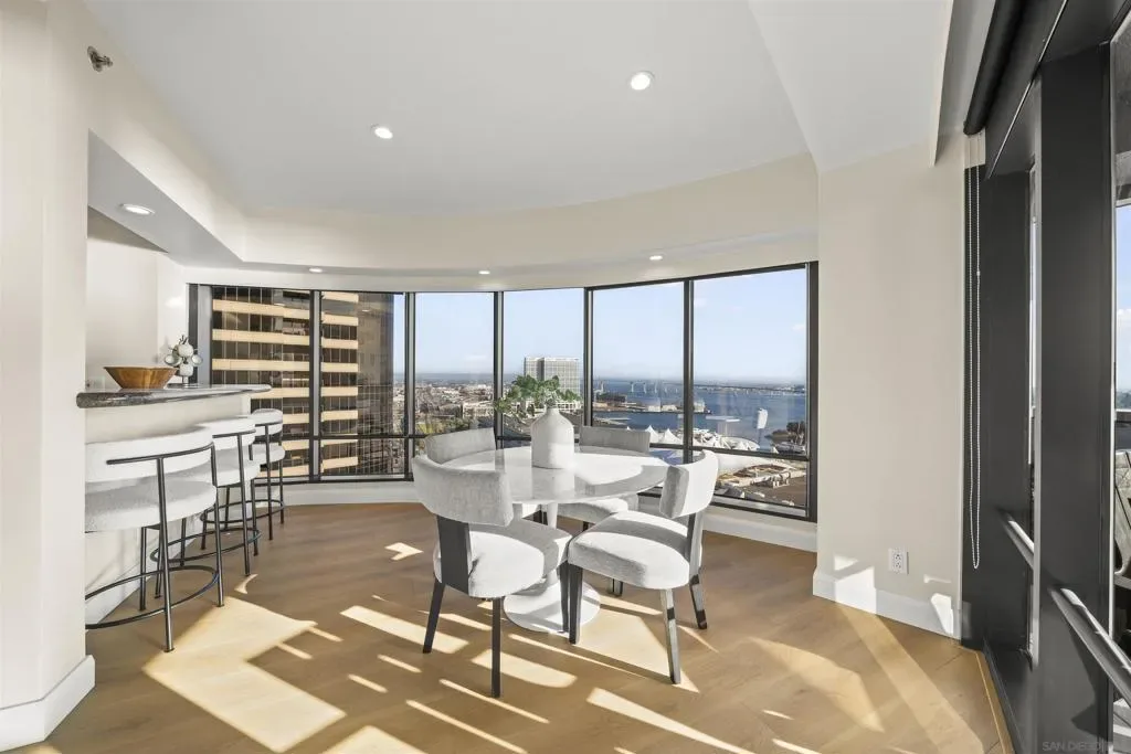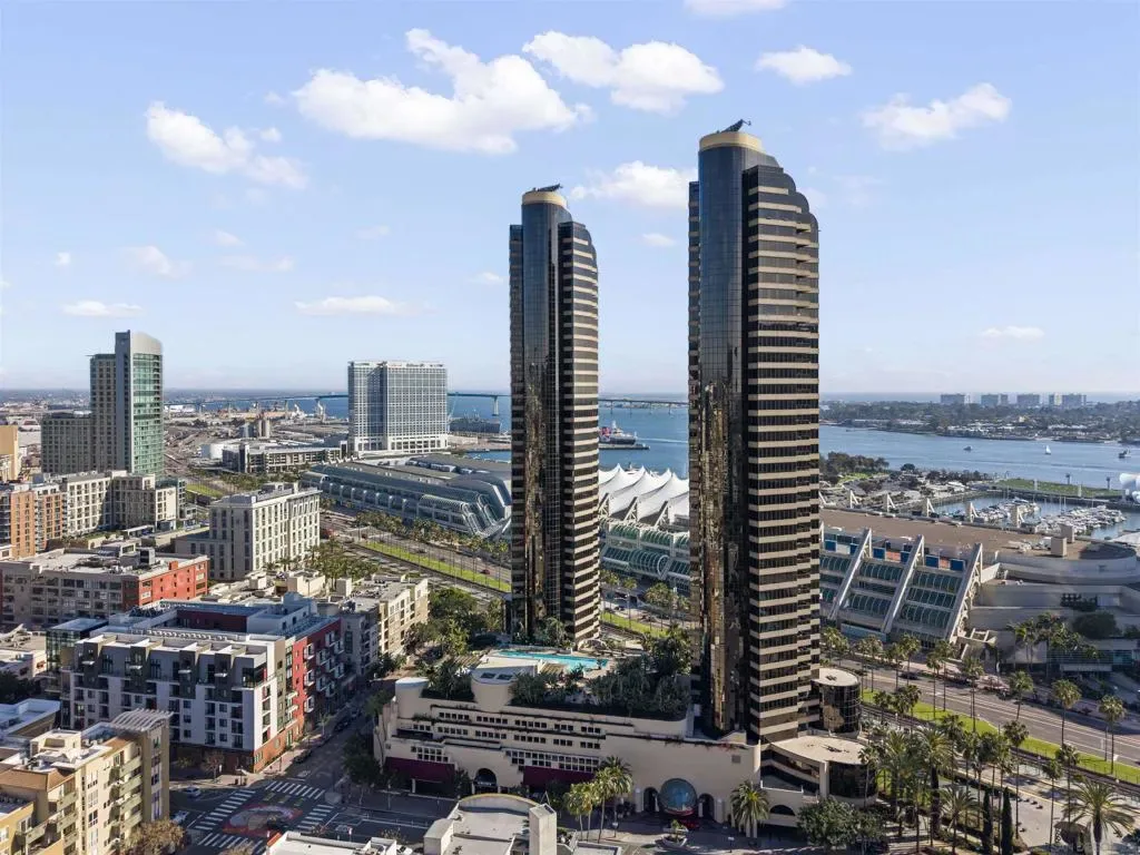 Welcome to Harbor Club Residence 2405, featuring the iconic “bubble” floor plan and positioned high on the 24th floor. This 2-bedroom, 2-bath residence offers breathtaking, unobstructed views from every room, spanning the bay, Coronado, the Coronado Bridge, and the Downtown skyline. Set on the true front row of Downtown’s waterfront, this residence offers one of the closest possible positions to the bay, with no residential development permitted south of Harbor Drive. The signature curved “bubble” layout maximizes glass and view exposure, creating a bright, dramatic living experience throughout. The home has just been refreshed with new flooring, fresh paint, and a new dishwasher, along with additional upgrades completed over the years. The spacious primary suite features a custom walk-in closet, while both bedrooms enjoy incredible panoramic views. An exclusive-use EV charger was also installed at the unit’s parking spaces. Harbor Club has long been one of Downtown’s most desirable addresses, known for its prime location and protected, unobstructed views. Residents enjoy a full-service luxury lifestyle with amenities that include a rooftop pool and spa, clubhouse, fitness center, sauna, 24-hour concierge and doorman, and a private library and meeting space. A rare opportunity to own one of Harbor Club’s most sought-after floor plans in a premier waterfront setting.