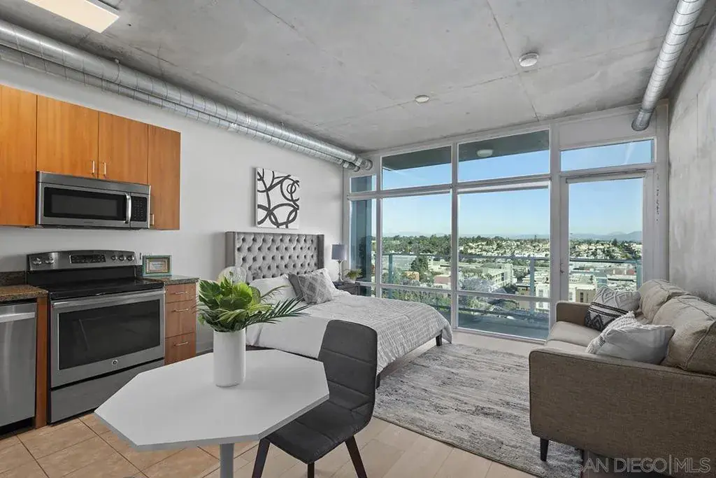 Elevate your urban lifestyle with this Smart Corner residence, ideally positioned in the vibrant heart of East Village. This east-facing studio is a true vantage point showcasing views of the city skyline, Balboa Park, distant mountains, and even glimpses of the iconic Coronado Bridge from your own balcony. Designed with an industrial-chic aesthetic, the home features stylish concrete accents and exposed ductwork that pair beautifully with the recently installed luxury vinyl plank flooring, creating a modern, loft-inspired atmosphere. The kitchen is equipped with updated stainless appliances, while the bathroom offers a practical shower/tub combination. Fresh interior paint and a secured parking space add to the comfort and convenience. Exceptionally versatile, this studio serves perfectly as a smart investment property, an efficient live-work space, or a serene urban retreat. Discover the ease of Downtown living in this East Village pied-à-terre, where dining, culture, and transit are just steps away. Smart Corner is an all-encompassing hub of work, play, shop, and live! It is conveniently located near the 163 freeway, I-5, Highway 94, Petco Park, the Gaslamp Quarter, and Balboa Park. A trolley station located directly below the building ensures Smart Corner has all an urban dweller could want. Amenities include a roof-top sun deck with spa, a barbecue area, gym, and wet bar on the 20th floor, and fully equipped exercise room. Welcome home!