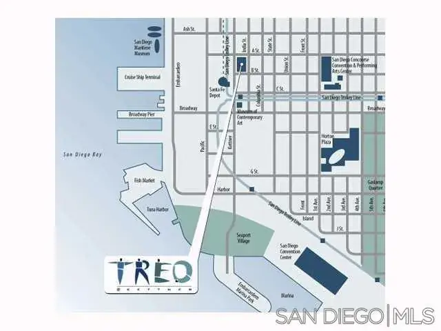 Treo is perfectly situated in Little Italy/Columbia. This condo offers an ideal blend of vibrant city living and peaceful retreat. Ideal space in a highly popular Little Italy-Columbia. Work from home! The best of San Diego is literally at your doorstep from amazing restaurants and coffee houses to nearby San Diego harbor front and easy access to San Diego Int’l, Downtown, world famous San Diego Zoo, historic Balboa Park. Concierge, Pool, Spa, Gym, BBQ, conference/community room, security, Secure underground parking. W/D in unit with Gas range. City Views/Lights off East facing Balcony. Pool located in sunny area!