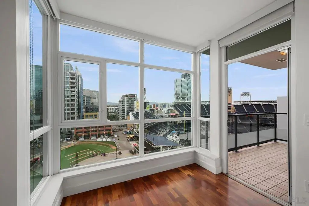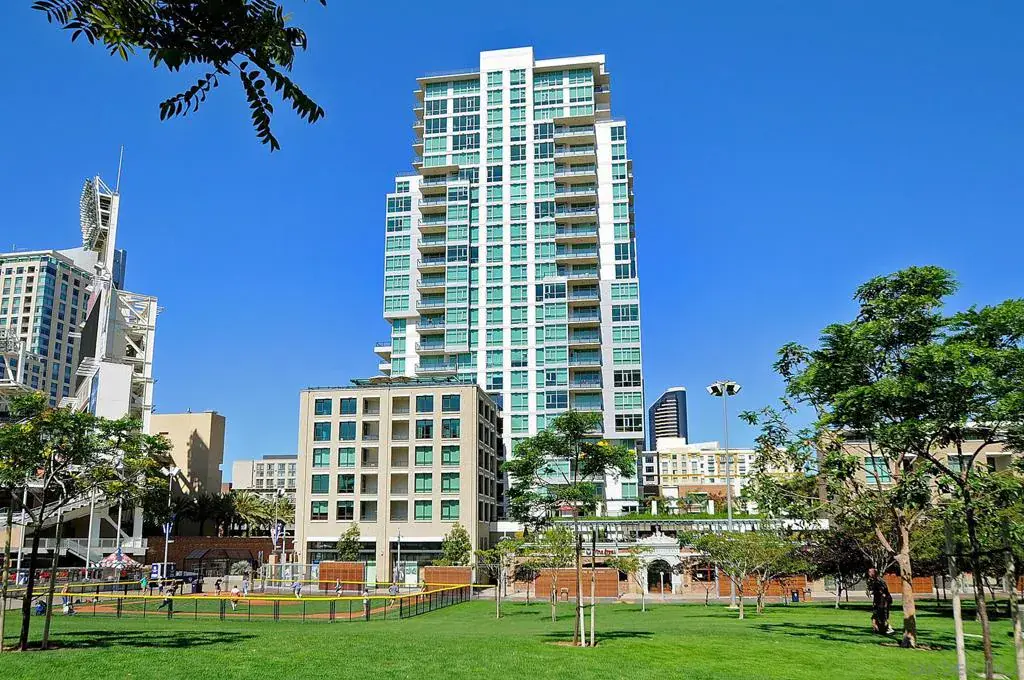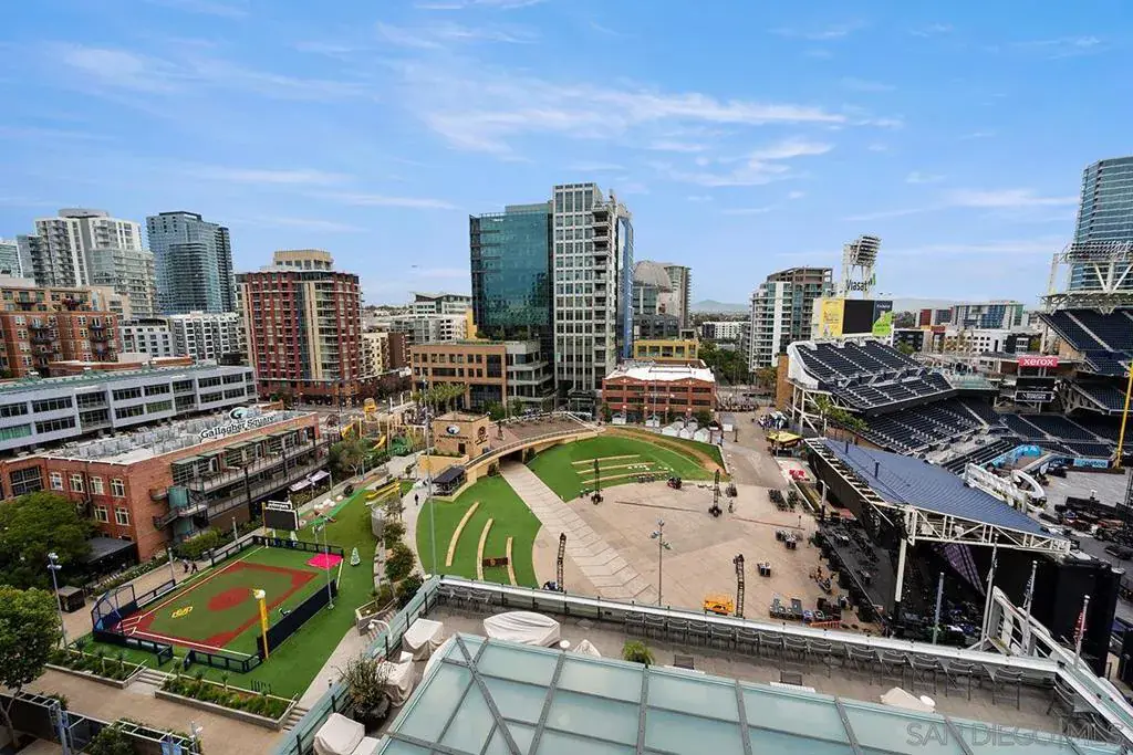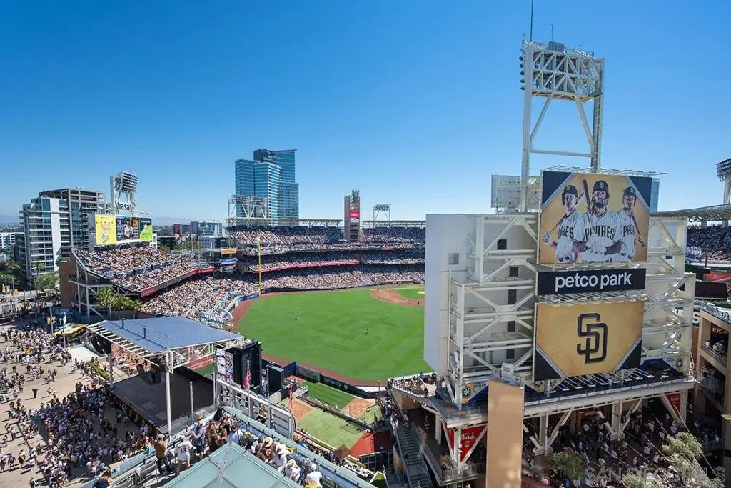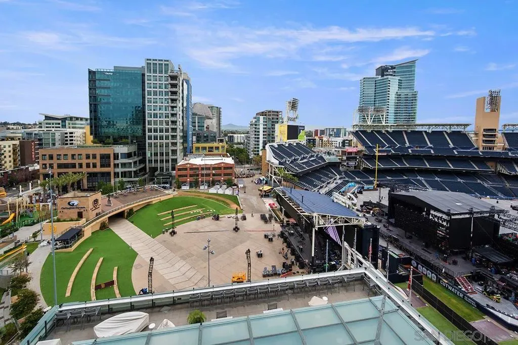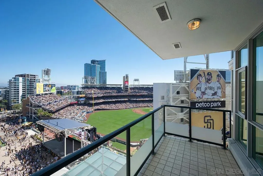 This 10th floor 2 bedroom/2 bath condo at The Legend is a homerun; captivating views directly into San Diego’s famed Petco Park! First time ever offered for sale by the original owner, enjoy baseball games and open-air concerts right from your living room or your spacious balcony – or from the incredible 7th floor ‘Club Legend’ deck. Great natural light from expansive windows, new paint and carpet, a split-bedroom floor plan ideal for privacy, and an open-concept granite and stainless kitchen. Complete with a parking space near the elevator and private storage just steps from your front door. First of this floor plan to hit the market in 6 years! See supplement for more details. The gourmet kitchen is a chef’s dream, showcasing stainless appliances, granite countertops, European-style cabinetry, and an inviting eat-at bar illuminated by elegant pendant lighting. Floor-to-ceiling windows not only flood the condo with natural light but also offer breathtaking, unobstructed views of Petco Park and Gallagher Square. The split-bedroom floor plan is perfect for privacy for roommates or guests. The primary bedroom suite doesn’t skimp on views either. The ensuite bathroom features a dual vanity, tasteful custom tile backsplash, and frameless glass-enclosed shower. The Legend is the only residential high-rise to be built inside the gates of our Major League Ballpark & the only residential tower to be built on the 3-acre Park at the Park / Gallagher Square! This iconic building overlooking the Padres ballpark (voted the best ballpark in America) will be treasured for generations with historic detailing preserved by Bosa Development to create a world-class residential tower. The Legend is centrally located just a few blocks from the Gaslamp Quarter & Marina District for convenient access to endless shopping & dining options. The Legend’s amenities include a 2nd floor rooftop deck looking out over Park at the Park complete with pool & spa, fully equipped fitness room, roof garden, barbeque area, steam, sauna, and changing rooms. Entertain guests in ‘Club Legend’, the 7th-floor social lounge featuring a sprawling rooftop terrace with panoramic Petco Park views and a cozy outdoor fireplace lounge and outdoor kitchen. Additional conveniences include guest parking reservations via mobile app, 24-hour concierge and security services, and plans for EV charging stations within the secured garage. Previous builder documents cited 972 sq .ft., assessor records now indicate 888 sq. ft. VA Approved (000017) & FHA Approved(S007729)!