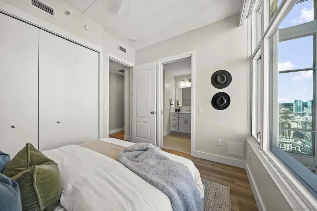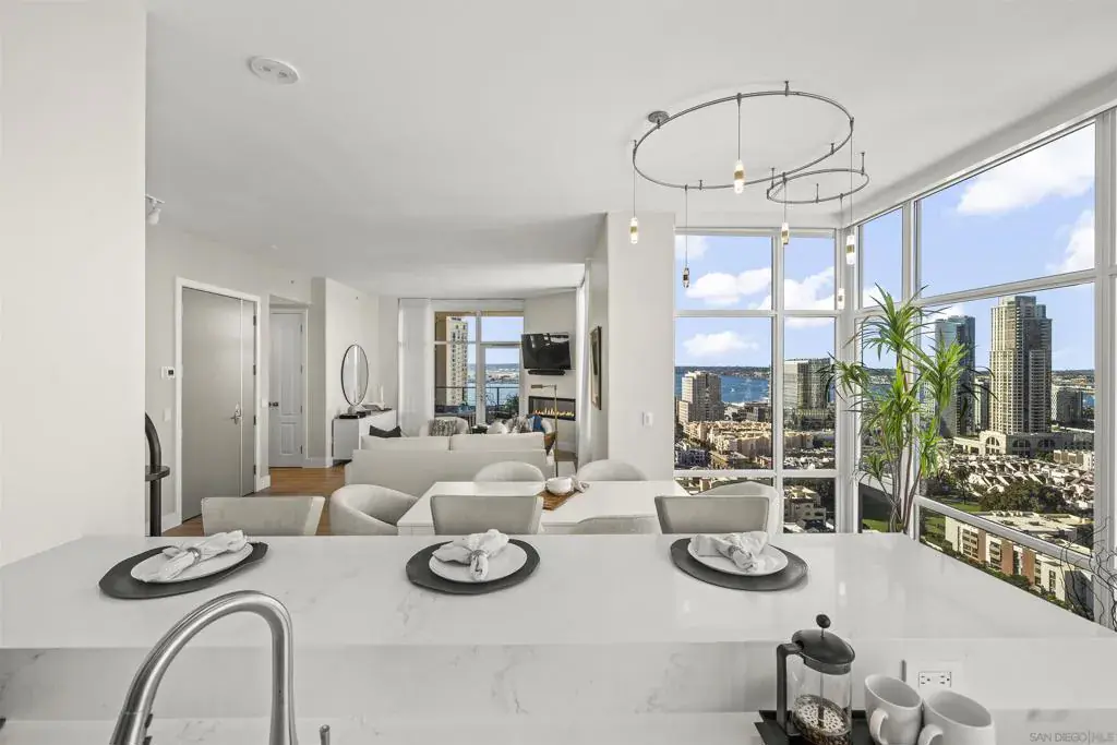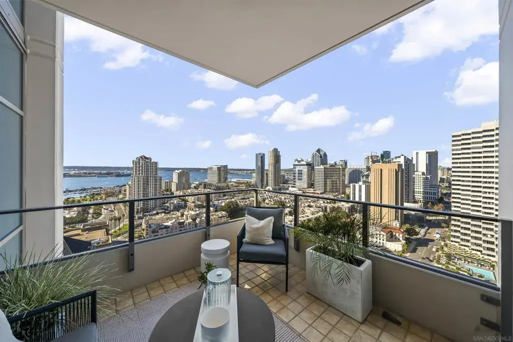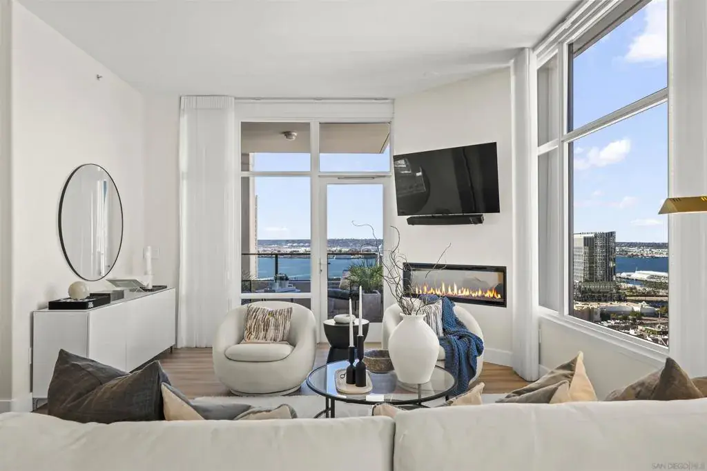 Step into luxury with this impeccably remodeled 2BR/2.5BA 23rd floor residence offering expansive West, North & East facing views! The grandeur of the space is accentuated by 10.5 ft ceilings + floor-to-ceiling windows, complemented by two private balconies perfect for soaking in San Diego’s breathtaking sunsets, watching ships sail by, and admiring the views of Coronado Island and city lights. This residence has been recently remodeled with extensive upgrades including updated flooring throughout, modern kitchen cabinetry, Caesarstone countertops, state-of-the-art kitchen appliances + washer/dryer, California Closet built-ins, upgraded electrical + lighting, and more! Additionally, both bedrooms feature en-suite baths that have been fully remodeled, and there’s a separate powder room for guests. Moments from Seaport Village, The Rady Shell, Gaslamp District and Petco Park, Pinnacle offers white-glove concierge service, a world-class gym, steam and sauna facilities, a guest suite, a stylish lounge, a 95 ft lap pool + spa & more. Residence #2303 also offers two underground parking spaces and a storage unit. This home epitomizes sophisticated urban living, with every detail thoughtfully considered and upgraded.
