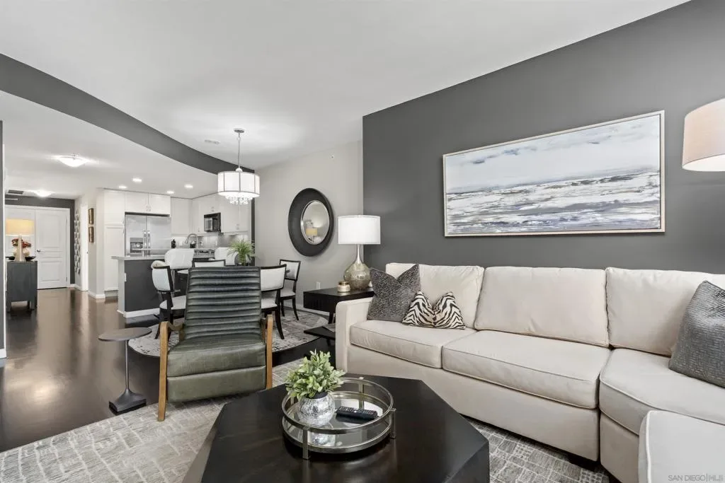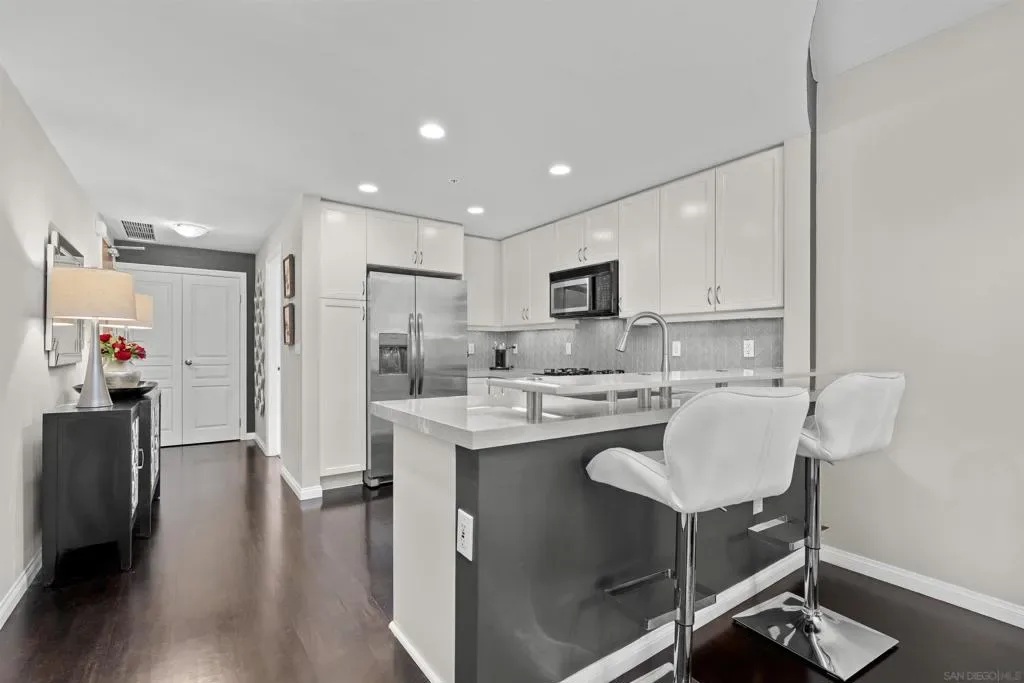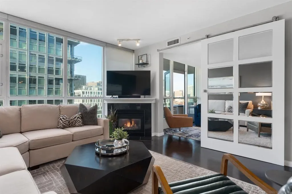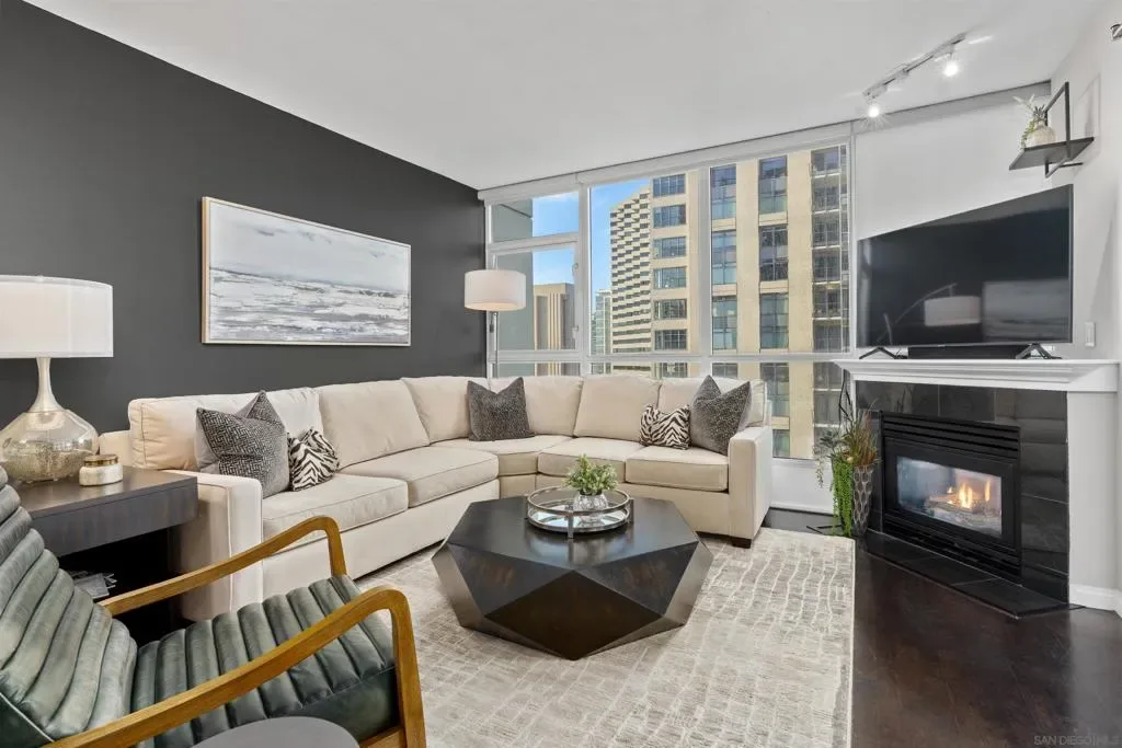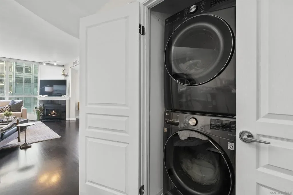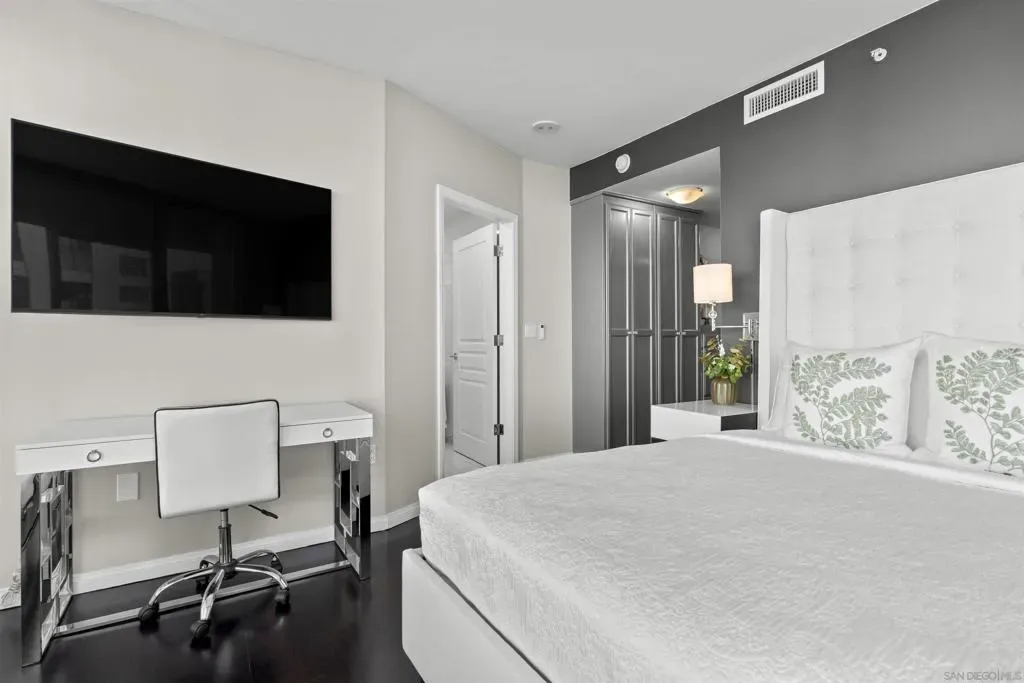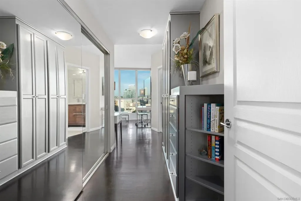 Enjoy stunning north-facing views of San Diego Bay and the Downtown skyline from this professionally designed 1-bedroom + den, 2-bath residence. Bright, open living spaces feature expansive windows and a spacious private patio ideal for indoor-outdoor living. The primary suite offers floor-to-ceiling windows, patio access, custom built-ins, a workspace, and an ensuite bath with dual sinks and a walk-in shower. A flexible den serves as a lounge or guest space with direct patio access. Offered fully furnished with designer pieces (approx. $30,000 value) from Arhaus, Pottery Barn, and Crate & Barrel, may be included at no additional cost and conveyed in current condition at close of escrow. Ideally located in the heart of the Marina District, Horizons offers an unbeatable downtown lifestyle just steps from the New Children’s Museum, Martin Luther King Jr. Promenade, Seaport Village, Petco Park, the Gaslamp Quarter, San Diego Bay, and the Marina. A children’s park and dog park are located directly behind the community. Resort-style amenities include a pool, spa, BBQ area, fitness center, concierge, security, billiard room, conference and club rooms, and 16 guest parking spaces. Everyday convenience is built in with retailers just an elevator ride away, including a bank, dry cleaner, Postal Annex, coffee shop, and more. The building has been refreshed with beautifully remodeled lobbies, upgraded hallways, and new unit doors with keypad access, all within walking distance to transit, dining, shopping, and Ralphs Signature Market.