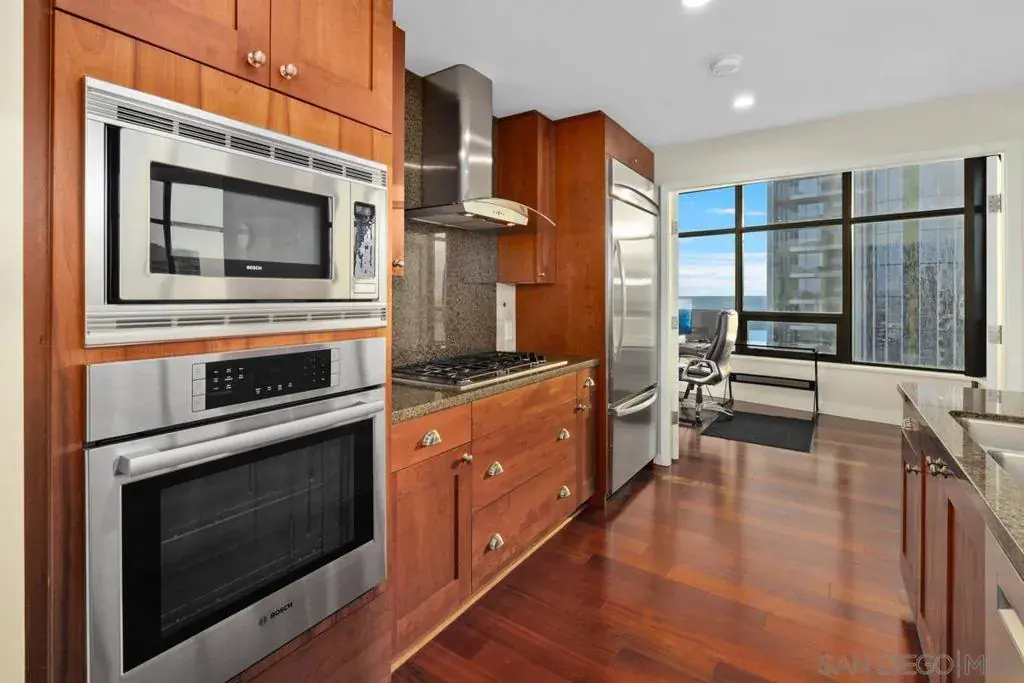 Behold a one of a kind exclusive retreat, perched majestically on the 35th floor of the iconic Electra, high above San Diego’s vibrant heartbeat. This coveted northwest-corner residence unveils a sweeping panorama of the bay and city skyline, as though the horizon itself were framed just for you. Step inside—and be captivated by lustrous Cherry hardwood floors that flow beneath expansive windows, flooding every room with radiant daylight. A cozy fireplace infuses the space with soft warmth and an intimate ambiance. Two balconies beckon—the western terrace your private stage for nightly sunset dance over the bay. Culinary artistry awaits in your gourmet kitchen, outfitted with stainless-steel Bosch and Thermador appliances, polished granite counters, and a chic breakfast bar perfect for casual gatherings. Outside your front door, the excitement of downtown life is yours to embrace—just a short stroll to Waterfront Park, Seaport Village, and the eclectic energy of Little Italy. Here, luxury is not an afterthought—it is a way of life. A dedicated concierge attends to your needs, serene steam room, resort-style pool and spa, and fully equipped fitness center await your indulgence. On the tranquil 5th floor, Electra Park and BBQ terraces offer serene garden escapes amidst the urban hum with two parking spaces flanking a built-in EV charging station and a private storage. Ascend to new heights—experience life among the clouds in a residence that effortlessly elevates luxury and lifestyle into one sublime experience. Must see!