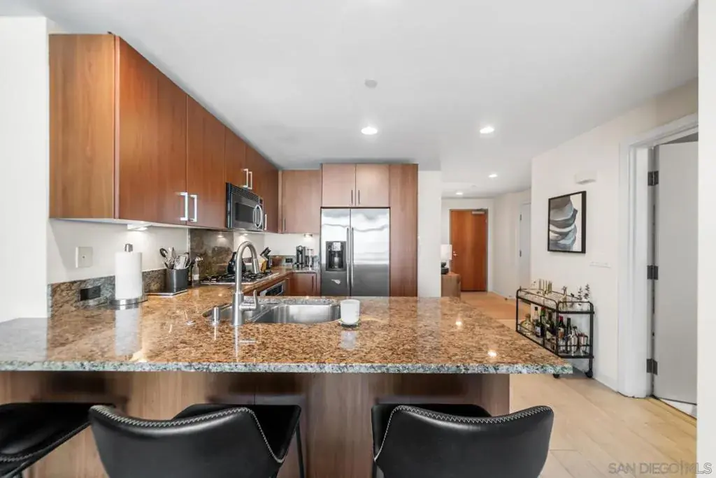 “The Mark” sets the standard for urban living in Downtown San Diego. Located just one block from Petco Park, the building offers a resort-style pool and spa, fitness center, conference room, and on-site management, maintenance, and security. A massive interior courtyard with BBQ and pizza oven completes the experience. Residence 504 features an open-concept layout with 11-foot ceilings, floor-to-ceiling windows, exposed concrete accents, waterproof vinyl flooring, and a private balcony showcasing striking views of the San Diego skyline. Just steps to the Gaslamp Quarter, Convention Center, and San Diego Bay. One parking space and an oversized 8’ x 7’ storage room are included.