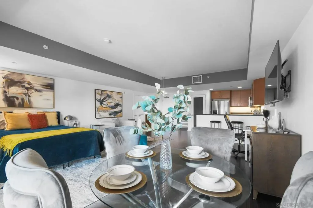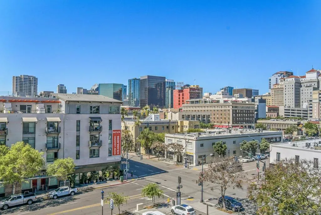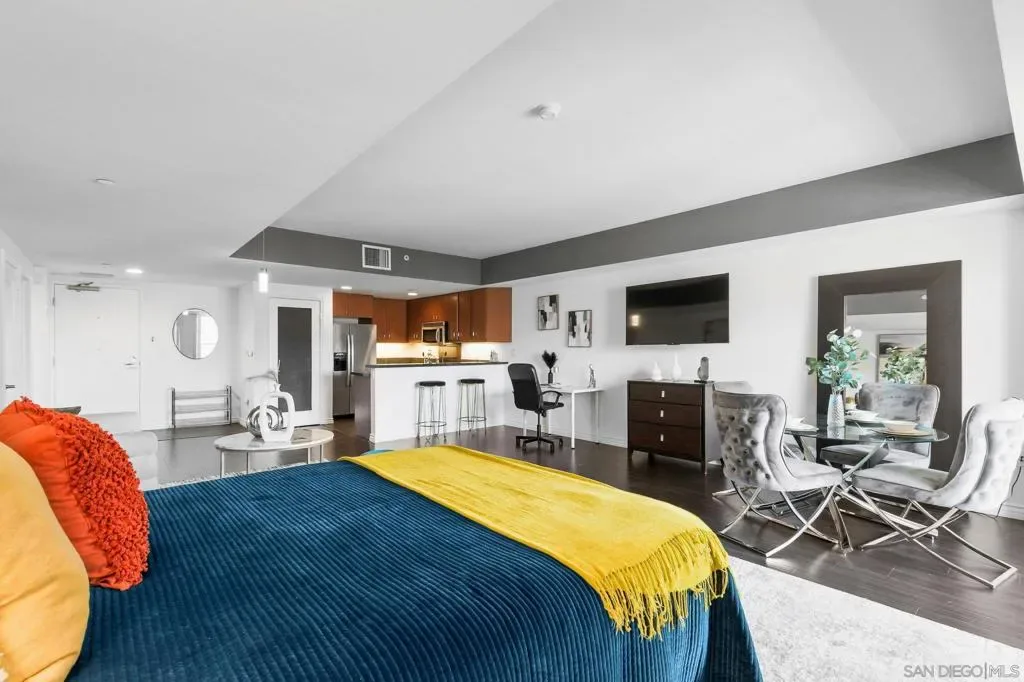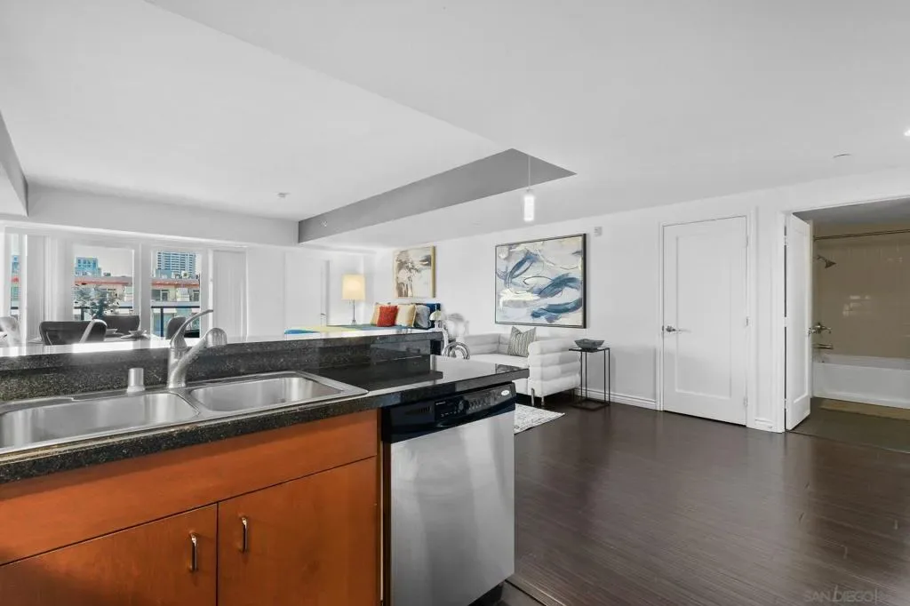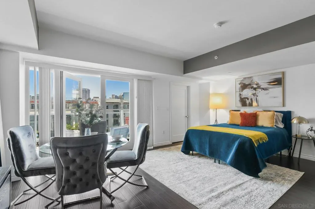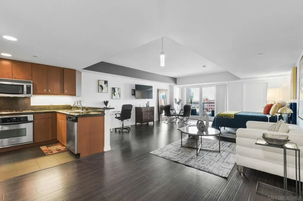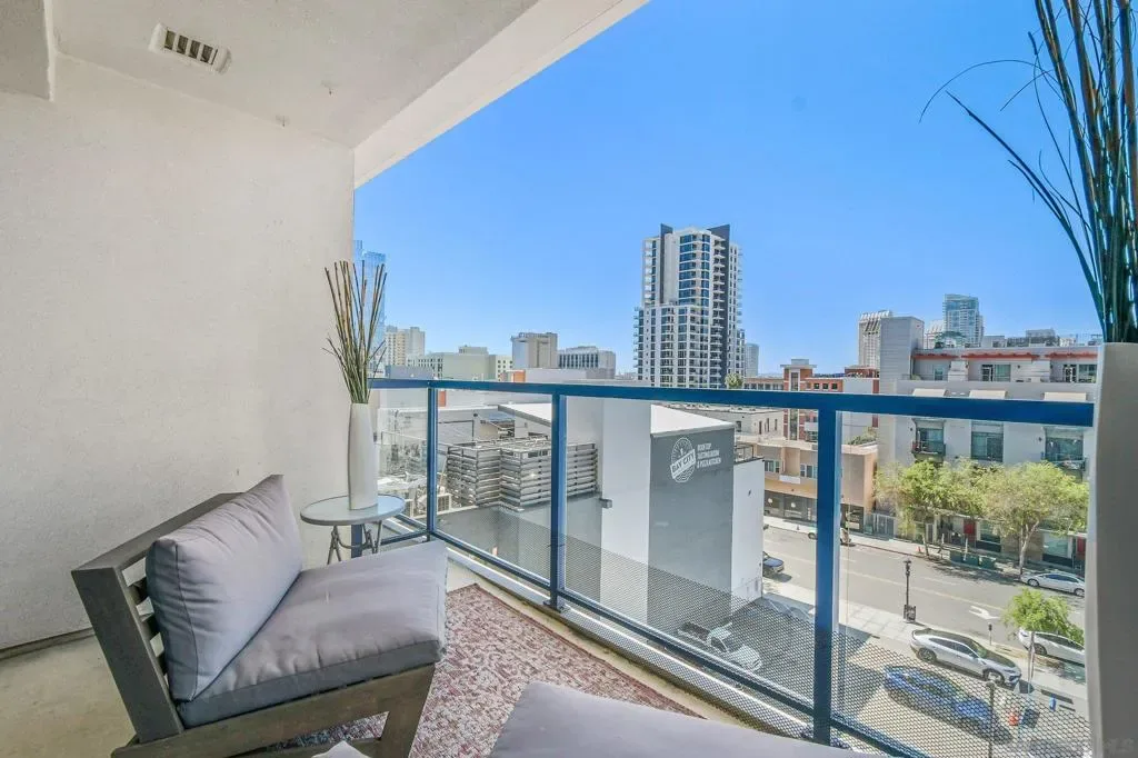 Exceptional location with walking distance to Petco Park, the Convention Center, Gaslamp, and more! This spacious 760 sq ft studio on the 5th floor features a modern kitchen with granite countertops, tile, and laminate wood flooring, and stainless steel appliances. Enjoy beautiful city views from the balcony accessed through a glass slider. The bathroom includes laundry hookups, and the unit is equipped with a rare walk-in closet, adding to its appeal. Larger than most 1-bedroom condos, this unit also comes with an assigned parking space. Upon stepping outside, you’ll find the ambiance open, clean, and airy. The building is meticulously maintained and offers a fantastic gym with an open floor plan. This building sits in a great location, low density corner. Don’t miss this incredible opportunity!