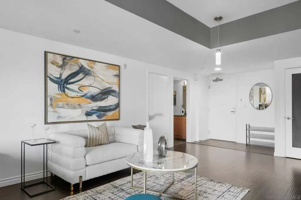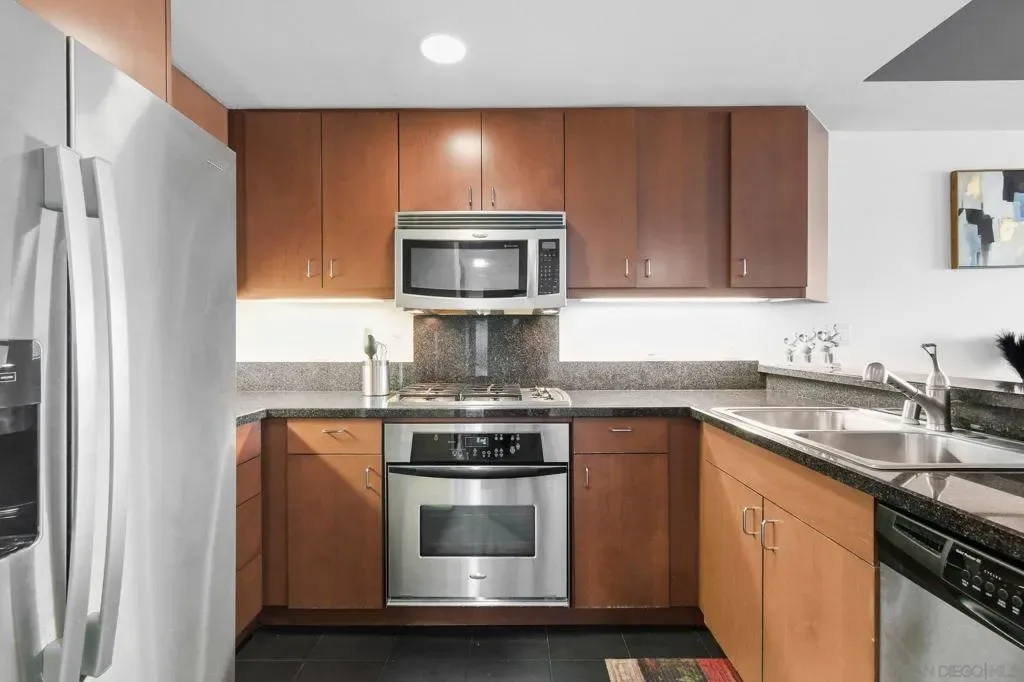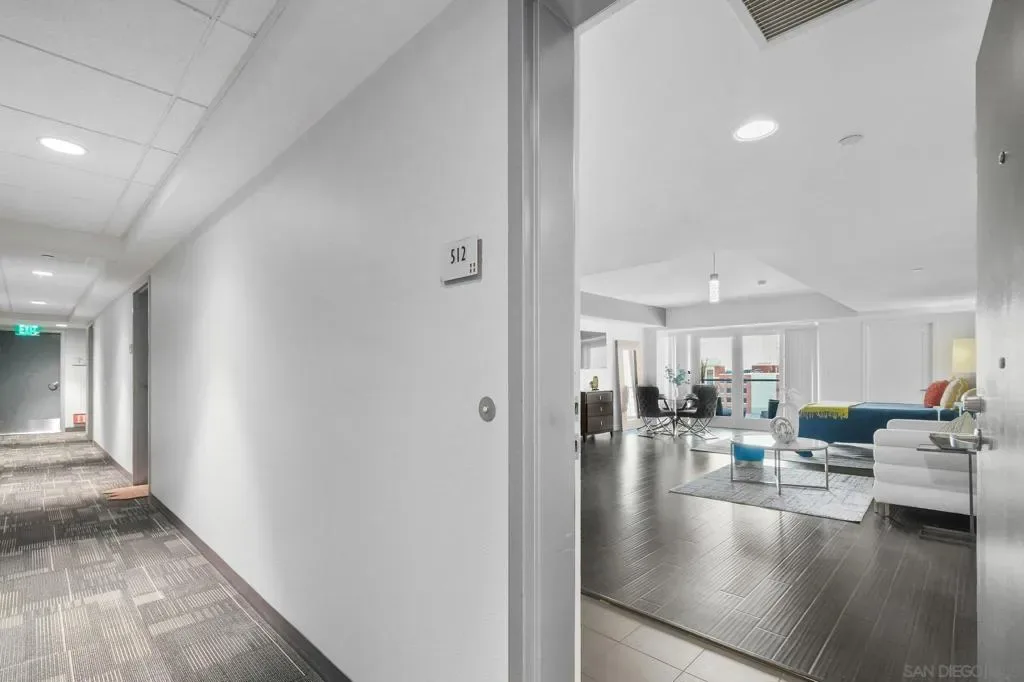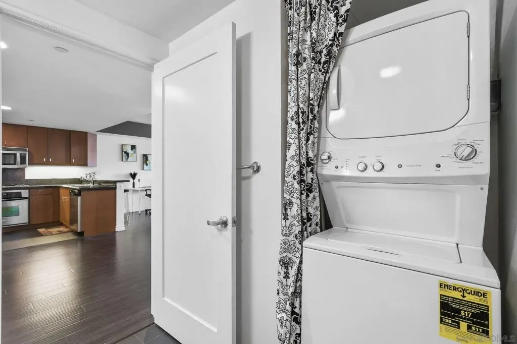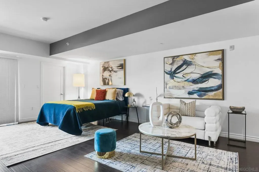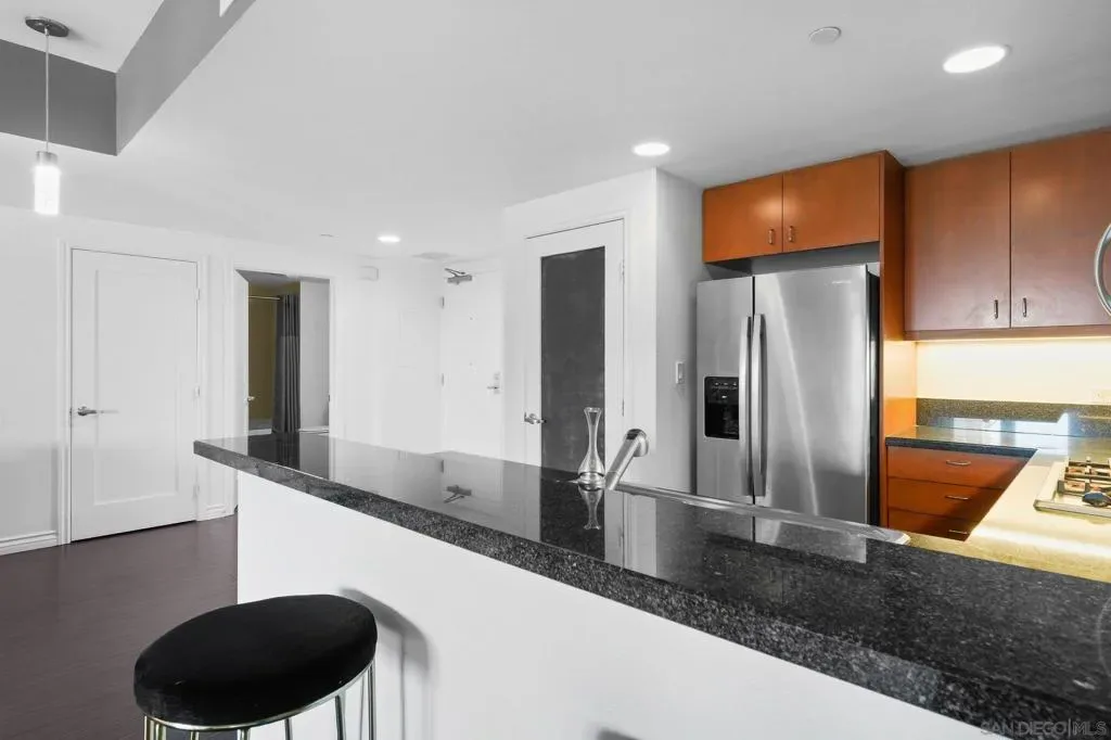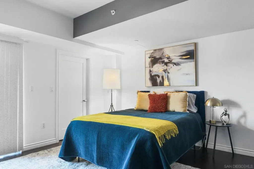 Exceptional location with walking distance to Petco Park, the Convention Center, Gaslamp, and more! This spacious 760 sq ft studio on the 5th floor features a modern kitchen with granite countertops, tile, and laminate wood flooring, and stainless steel appliances. Enjoy beautiful city views from the balcony accessed through a glass slider. The bathroom includes laundry hookups, and the unit is equipped with a rare walk-in closet, adding to its appeal. Larger than most 1-bedroom condos, this unit also comes with an assigned parking space. Upon stepping outside, you’ll find the ambiance open, clean, and airy. The building is meticulously maintained and offers a fantastic gym with an open floor plan. This building sits in a great location, low density corner. Don’t miss this incredible opportunity!