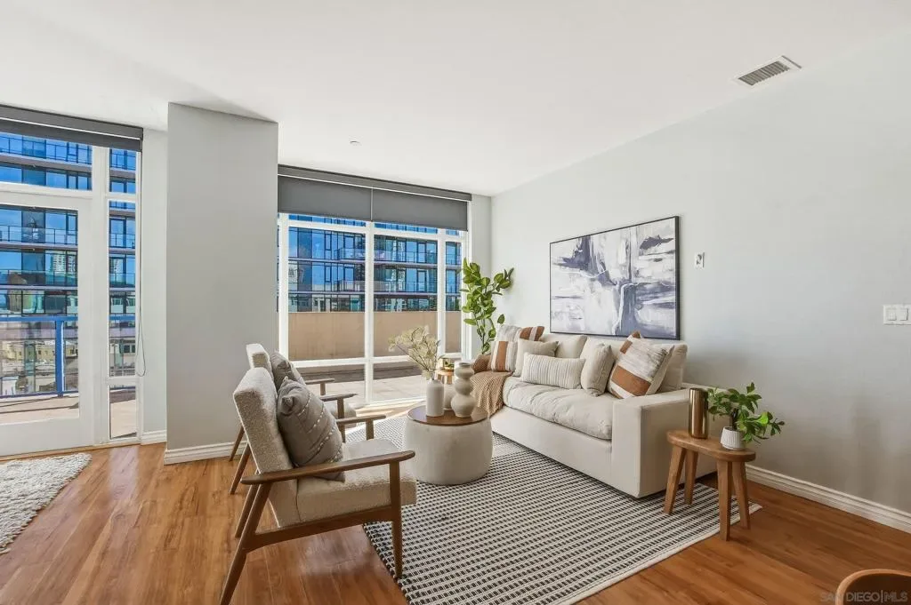 Welcome to elevated downtown living in this rare top-floor residence offering 2 bedrooms, 2 bathrooms, plus a dedicated space perfect for a home office. With no units above, this 1,294 sq. ft. home provides privacy, natural light, and seamless indoor-outdoor flow in the heart of the city. The open-concept layout connects the kitchen, dining, and living areas, flowing effortlessly onto an oversized private-use patio that spans the entire length of the unit. This is a unique and exceptional extension of the living space and ideal for entertaining, relaxing, or enjoying San Diego’s year-round weather. Expansive windows fill the home with natural light, enhancing the bright and airy feel throughout. The oversized primary suite features a generous walk-in closet and well-appointed bath, while the secondary bedroom and full bath offer flexibility for guests or additional workspace. Additional highlights include in-unit laundry and two side-by-side parking spaces conveniently located near the elevator. Residents enjoy access to community amenities including a fitness center and a shared outdoor patio with grill. Ideally situated just a few short blocks from the energy of the Gaslamp Quarter and the Ballpark District, this home offers unbeatable access to dining, entertainment, and city life while still providing a private retreat above it all.