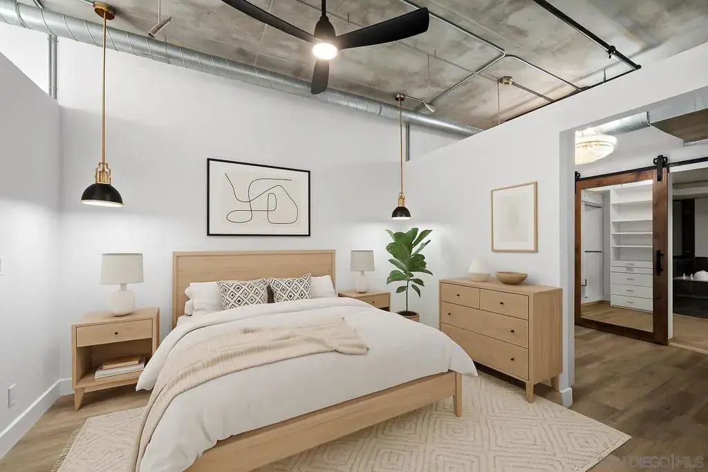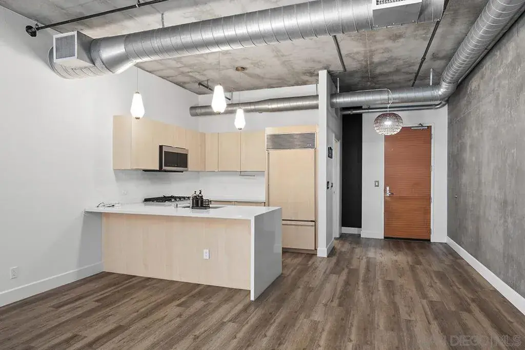 Step into this stunning, fully reimagined 1 bedroom + den Parkloft residence where urban sophistication meets modern comfort. This New York–style loft showcases soaring 10-foot ceilings, newly added walls, and over $25K in custom Rustica glass and metal doors that define the space with style and function. The versatile den offers options for a guest room, home office, or creative retreat, while the open-concept living area perfectly balances industrial charm with modern warmth. The chef-inspired kitchen boasts dramatic quartz waterfall counters, full backsplash, high-end Samsung and Subzero appliances, and designer lighting that enhances every gathering. The spa-like primary bath features large-format tile, vivid lighting, dual vanities, a jetted soaking tub, and a walk-in frameless glass shower. French doors off the great room open to a private balcony—complete with a natural gas hookup—ideal for entertaining or simply relaxing in the heart of East Village’s vibrant Ballpark District. One SUV-sized parking space and private storage room also included. Attention to detail continues throughout this residence, from the built-out primary closet with mirrored barn door to the thoughtfully redesigned guest bath with custom vertical tile and curated fixtures. Additional upgrades include newer front-load laundry, custom built-ins for storage, hard-surface flooring throughout, and designer lighting in every room. Smart-home features such as a Nest thermostat and LED accent lighting provide added convenience and energy efficiency. Parkloft offers an exceptional urban lifestyle with an attended Zen-inspired lobby, state-of-the-art fitness center, beautifully landscaped courtyard, and resident lounge with kitchenette—perfect for entertaining. Just steps from Petco Park, the Gaslamp Quarter, and the Marina District, this move-in-ready home blends privacy and sophistication with the best of Downtown San Diego living.