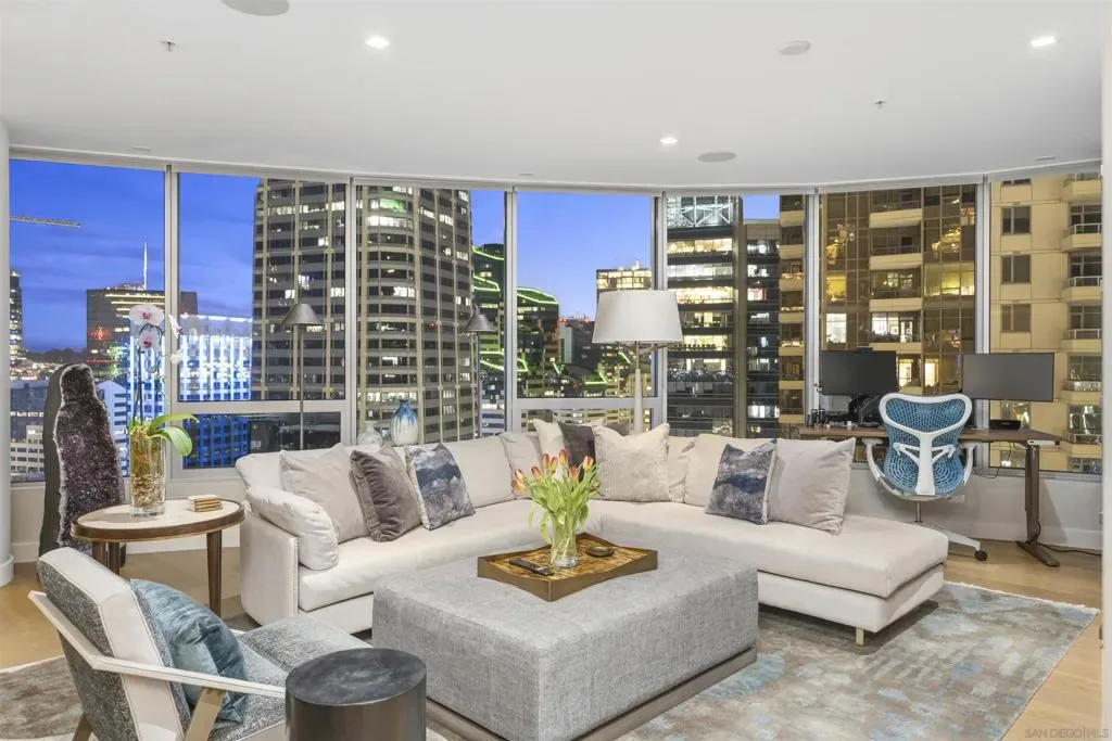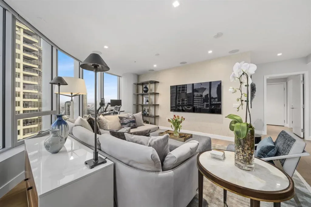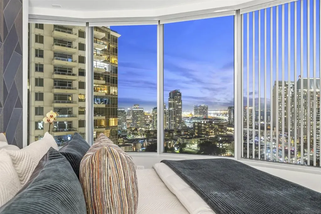 Perched on the 24th floor of Pacific Gate, Residence 2405 offers a rare corner layout with sweeping views of the downtown skyline, San Diego Bay and the Coronado Bridge. This 2BR/2BA residence features an open concept design with expansive windows and views from every room. The large private terrace is uniquely protected from wind while capturing stunning city lights and bay views, perfect for year-round indoor-outdoor living. The home is enhanced with premium upgrades including wood flooring throughout, heated primary bathroom floors and integrated smart home controls for lighting, climate and motorized shades. The modern kitchen showcases power-operated cabinets and a hidden built-in dog feeding station. Designer wallpaper adds a custom, sophisticated touch to the living room and primary suite. Both bedrooms feature custom closets by California Closets. The guest bedroom also includes a custom media and storage center, ideal for guests, a home office or flex space. Designed by Kohn Pedersen Fox, Pacific Gate offers a chef concierge, private yacht access, luxury car fleet, pool/spa, fitness center, steam/sauna, theater, business center and dog retreat.
