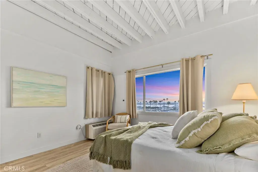 The interior blends modern comfort with coastal charm, featuring soaring open-beam ceilings, exposed brick, and expansive windows that fill the home with natural light. The open-concept kitchen includes sleek countertops, custom cabinetry, and stainless-steel appliances, seamlessly connecting to the dining area and living space, perfect for entertaining or relaxing while overlooking the harbor.