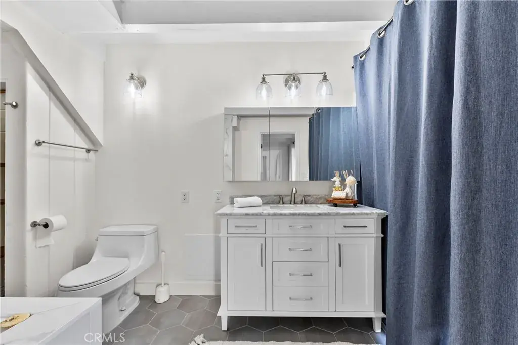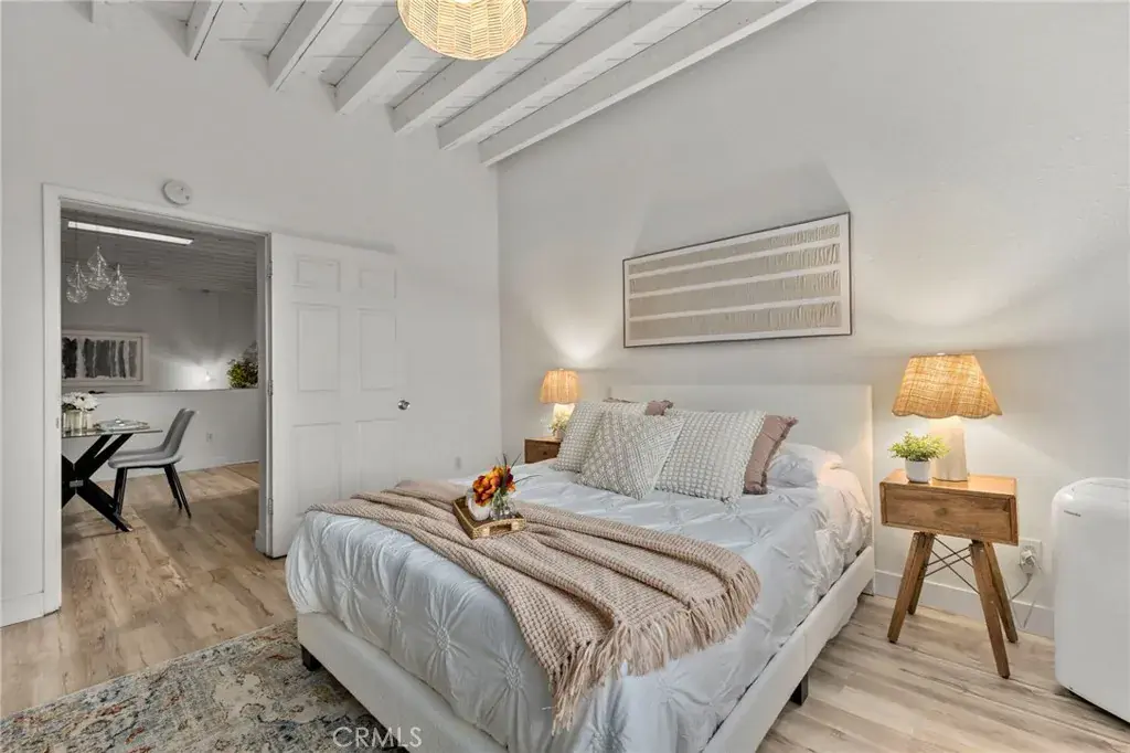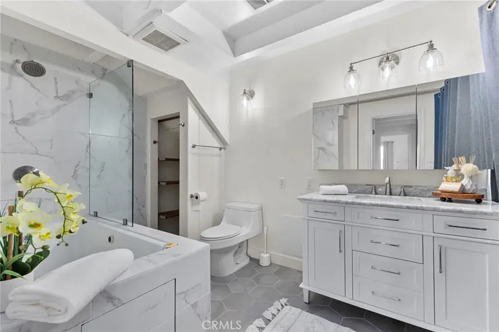 Each bedroom is uniquely positioned for privacy and comfort, highlighted by vaulted ceilings, natural light, and serene neutral tones. Both bathrooms have been fully updated with modern vanities, elegant tile, deep soaking tub and glass-enclosed shower.