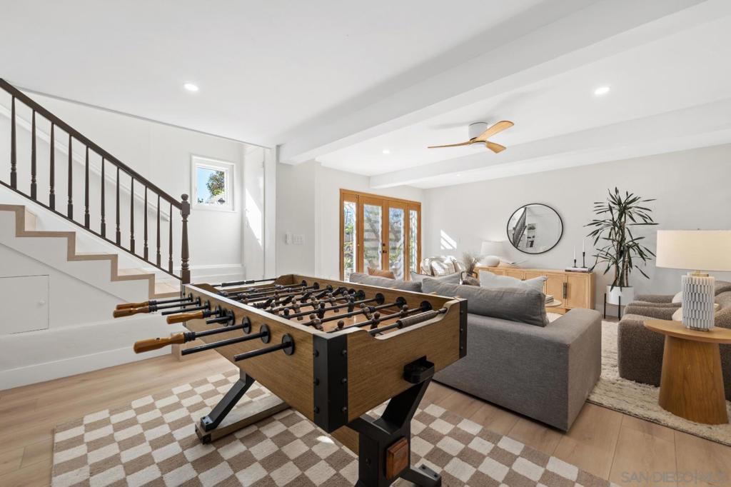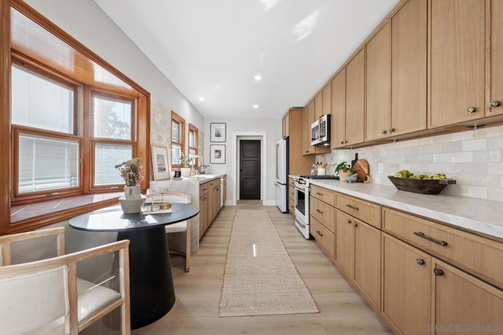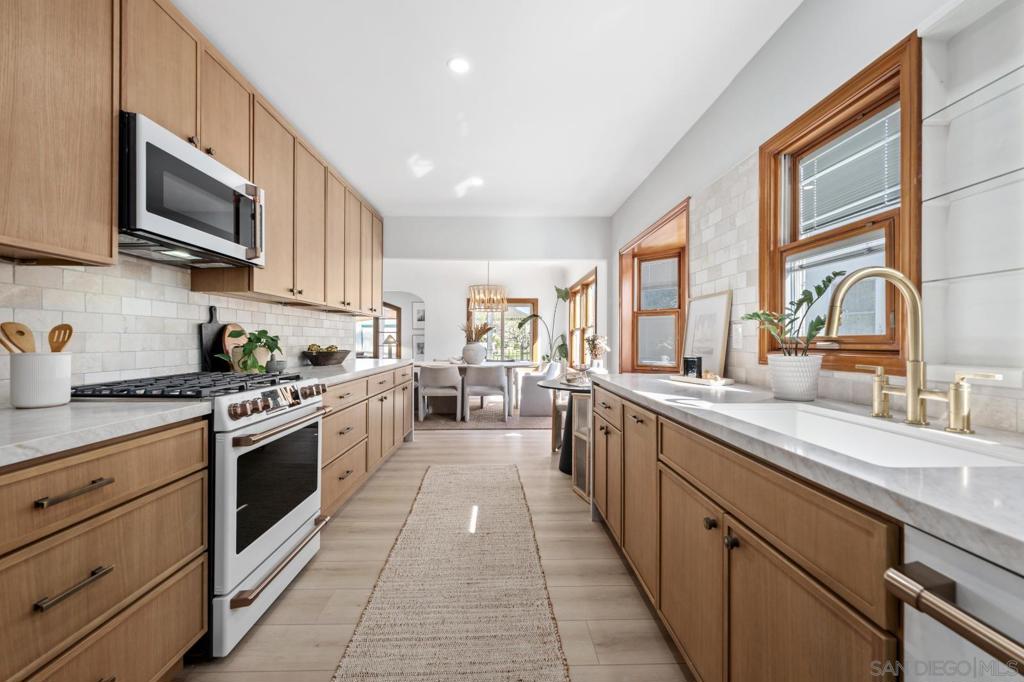 Experience this beautifully remodeled 2,268 sq ft Spanish-style home, ideally situated on a spacious canyon lot in the highly sought-after neighborhood of Kensington. Blending classic 1930s charm with thoughtful modern updates, this light-filled residence showcases timeless picture windows, wide-plank flooring, recessed lighting, and a soft, neutral palette throughout. The inviting galley-style kitchen offers abundant cabinetry and counter space, accented by a sleek glass tile backsplash and refined finishes. The serene primary suite serves as a true retreat, complete with a spa-inspired bathroom featuring a stunning tiled shower and contemporary details. Downstairs, a versatile bonus space provides endless possibilities—perfect for a family or game room, home office, gym, or guest quarters. Step outside to a covered patio ideal for entertaining, while the canyon setting adds a sense of privacy and lush natural beauty. Plus owned solar! Located in one of San Diego’s most desirable communities, Kensington offers charming local shops, dining, parks, and convenient freeway access. This exceptional home is a rare opportunity you won’t want to miss.