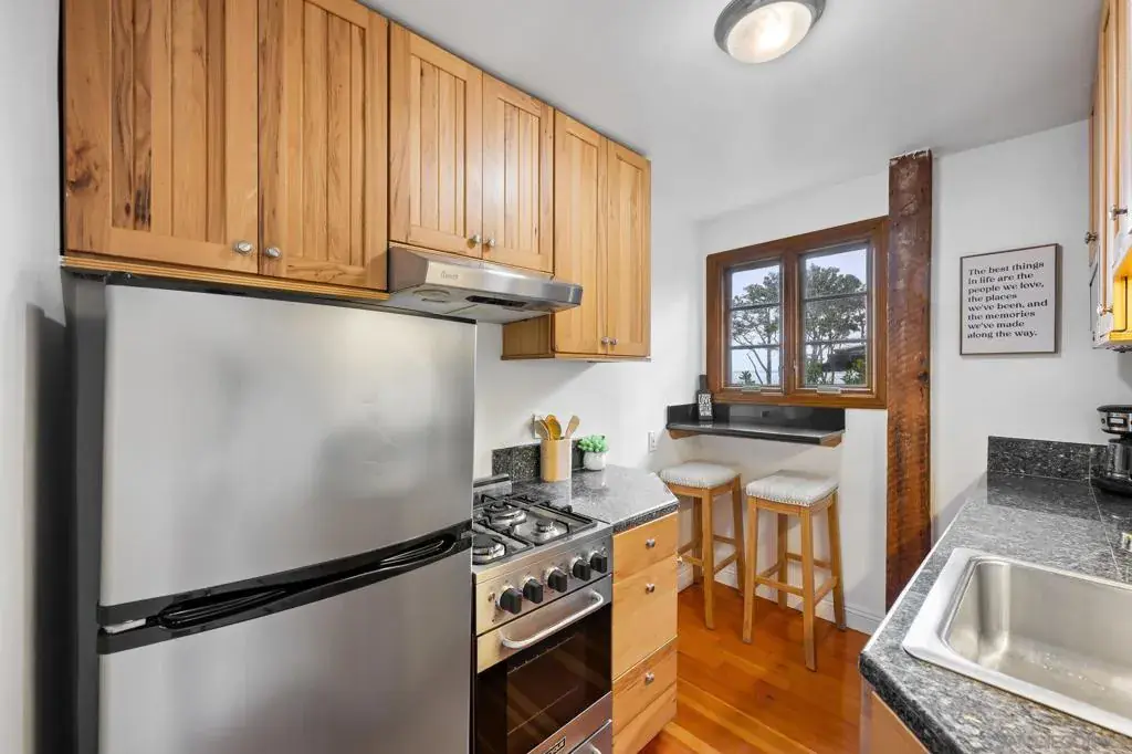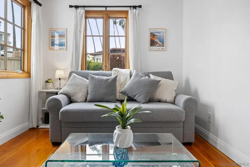 “weekly/monthly” furnished rental! This is a Charming and unique one bedroom apt in a 5-unit building in La Jolla with access to the Village & Cove right out your front door! Everything you need for 1 or 2 people – comfortable bed, desk, TV, couch, hardwood floors, kitchen, clean and functional bathroom with windows everywhere to take in that ocean breeze. Walk to La Jolla Village shops, restaurants and galleries. Explore the Cove, nearby trails and Children’s pool, just a short walk away. This is a unique and historic property with lots of charm! You will climb 2 small sets of stairs to reach the lower-level unit. The entrance is at the side of the property, you’ll enter through a gate and walk up some stairs to reach the front door. The apt has a small living room with a couch, TV, desk and coffee table. The bedroom has a queen-size bed with windows facing the street and ocean. The kitchen and bathroom and both clean and functional with all the basics you need. At the end of the hall is the entrance to the cellar which has a coin operated washer and dryer. There is currently no parking spot available, but there is limited street parking as well as a parking garage across the street from the property. Everything is cozy and comfortable; you should have everything you need to relax and enjoy your stay after a long day exploring the village and cove.