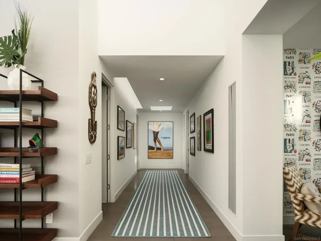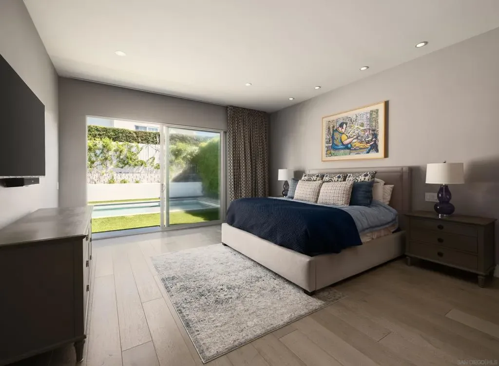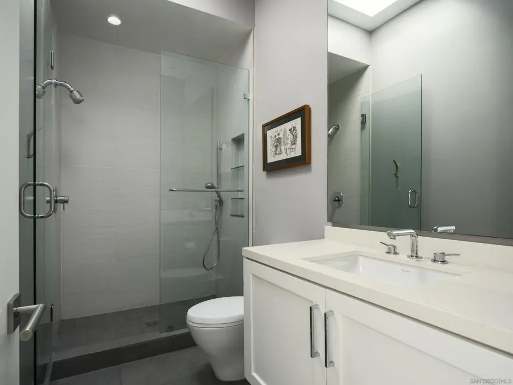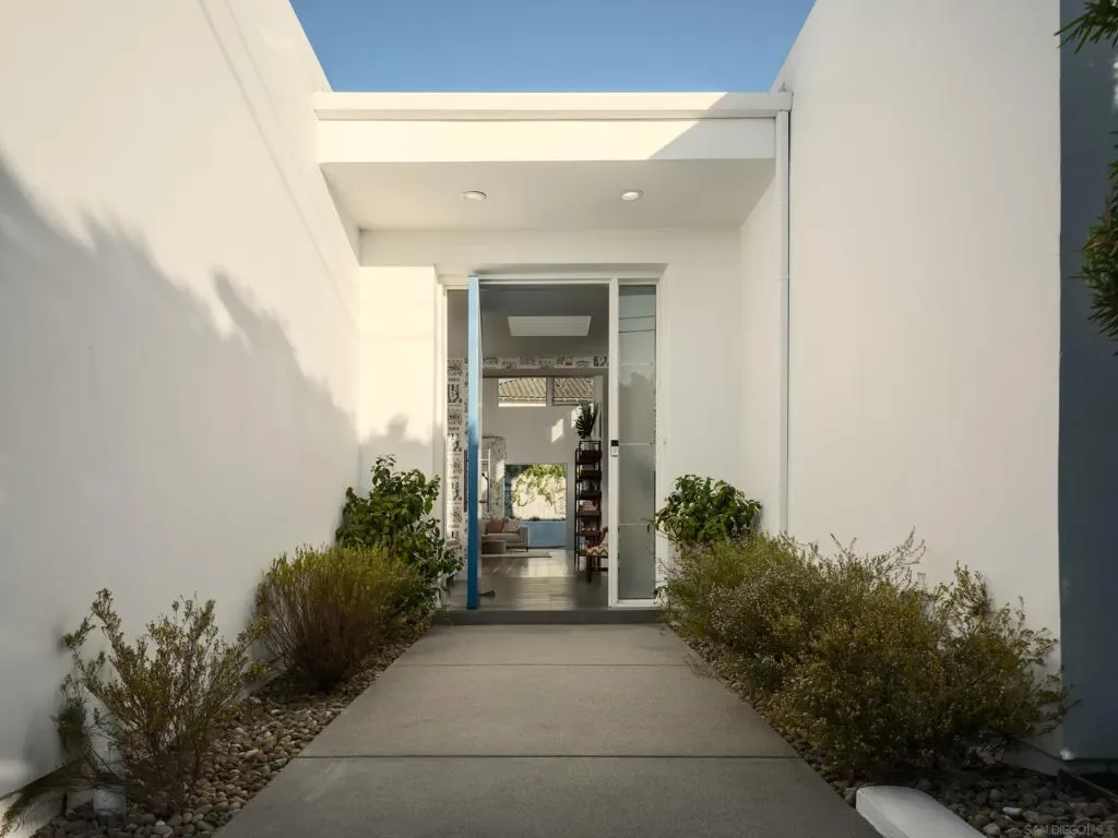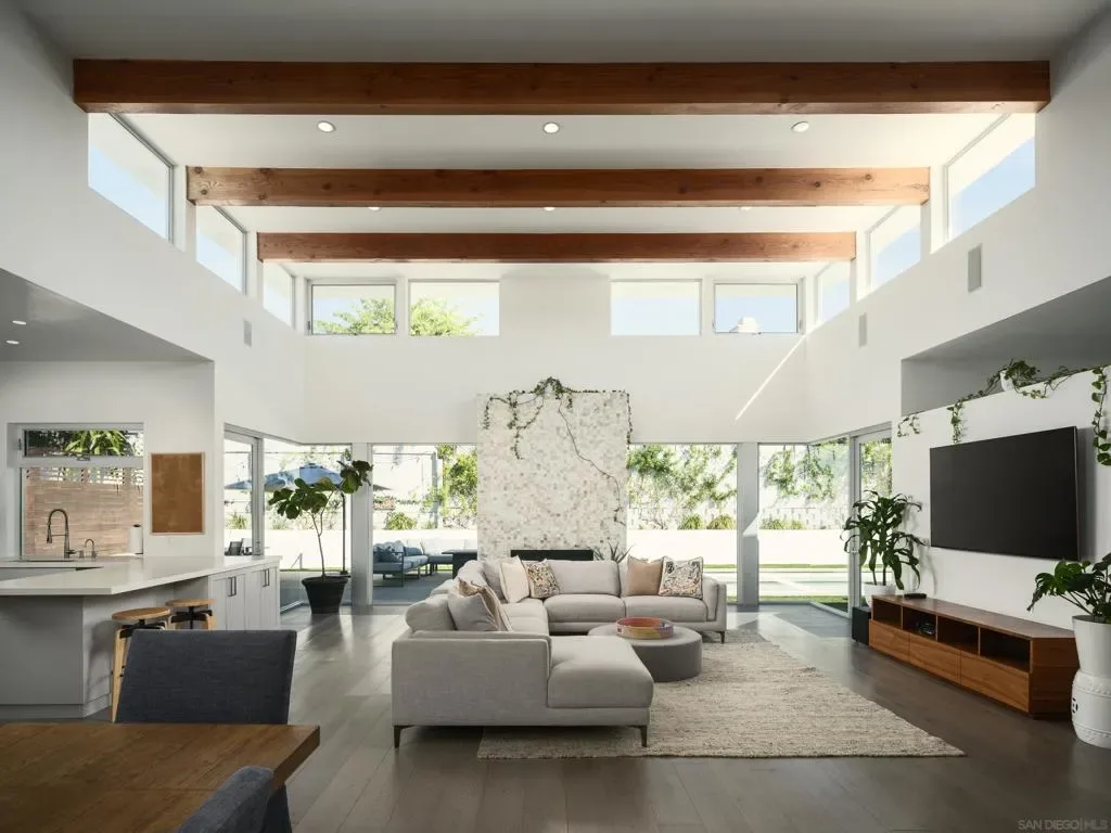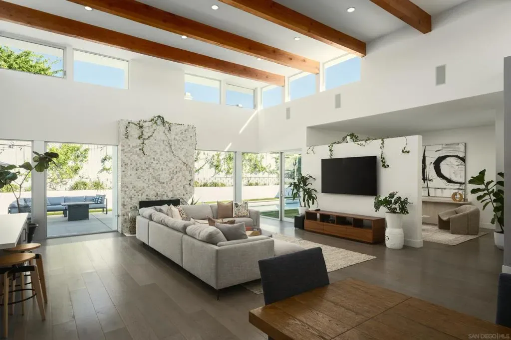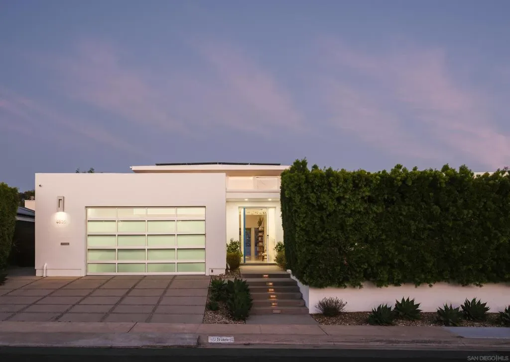 A striking single level residence designed to captivate from the moment you arrive. Enter through an impressive pivot door into a thoughtfully curated warm contemporary home that immediately delivers scale, light, and sophistication. Three generously sized bedrooms each feature en suite baths and spacious walk in closets, creating a true retreat experience. A fourth bedroom, privately situated near the entry with its own exterior access within the gated grounds, offers exceptional flexibility as a guest suite, office, or multigenerational living space. The home is designed for both lively entertaining and comfortable everyday living. Expansive living areas are enhanced by soaring 16 foot ceilings, clerestory windows that invite in soft morning light, and seamless transitions to the outdoors through walls of glass. The chef’s kitchen is both functional and refined, anchored by a large island and complemented by a walk in pantry, while the adjacent dining area features statement lighting and a stylish bar. A separate family room provides a more intimate setting for relaxed gatherings. Outside, the property embraces a true indoor outdoor lifestyle with a saltwater pool, multiple seating areas, and mature hedges surrounding the property, providing ultimate privacy. Additional highlights include a sleek, design forward garage, an integrated whole home speaker system, solar system, and an electronic pool cover. Ideally positioned with close proximity to the Village of La Jolla, La Jolla Shores Beach, UCSD, freeways, the YMCA, and the area’s renowned biotech and tech hubs, as well as just moments from the acclaimed La Jolla Playhouse. This is an exceptional home, in one of La Jolla’s most coveted enclaves!