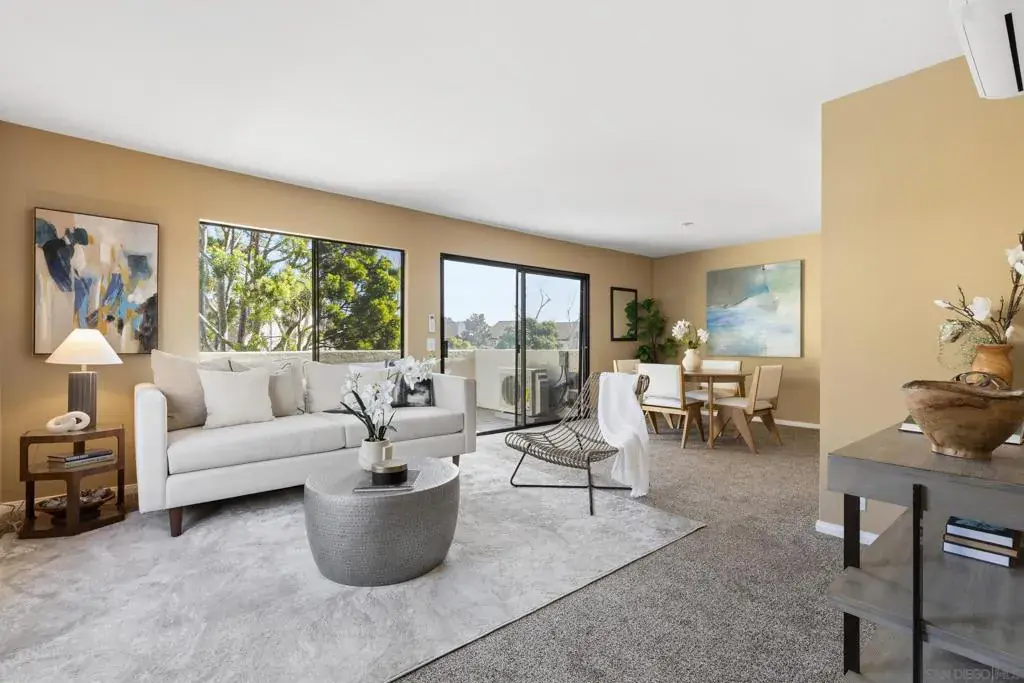 Beautiful end-unit condominium in the highly sought-after North Rim community, perched above Fashion Valley. This light and bright corner residence offers 1,098 square feet of comfortable living space with two bedrooms and one-and-a-half baths. Recent upgrades include all-new air conditioning and heating, brand-new carpet and paint, updated light fixtures, new closet doors, balcony off master bedroom, and large closet with built-ins in master bedroom. A private deck with southeast exposure fills the home with natural light. Enjoy the convenience of an attached two-car garage featuring a workbench, plus a large storage and laundry area. The well-maintained community offers resort-style amenities including a pool and spa, a clubhouse in close proximity to the unit, tennis and pickle ball courts, and ample guest parking. Scenic area views and a peaceful setting complete the experience. Ideally located just one mile from the University of San Diego, with easy access to shopping, dining, freeways, airport and everything Fashion Valley has to offer. This is a must-see home in a prime location.