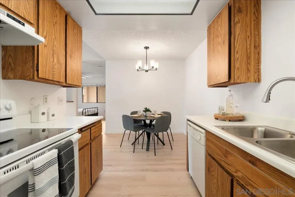 **Lowest priced 1/1 in MIRA MESA**Welcome to this light-filled upper-level condo featuring soaring vaulted ceilings and tasteful upgrades throughout. The interior showcases upgraded LVP flooring, fresh new paint and abundant natural light that enhances the open, airy feel. The kitchen has been refreshed with a newly installed garbage disposal,stove,sink,faucet and more…offering a functional layout ideal for everyday living. Located within the serene Quail Creek community, this home is surrounded by lush pine trees and set in a private, peaceful environment. Community amenities include a shared laundry room, pool and spa, as well as tennis and pickleball courts for an active lifestyle. Conveniently situated just minutes from Miramar College, shopping, dining, and with easy access to major highways, this condo offers a perfect blend of tranquility and accessibility.