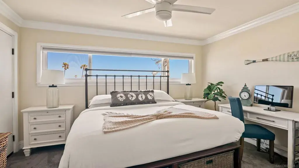 Welcome to your dream beach escape, a 2-bedroom, 2-bathroom oceanfront condo located directly on the Mission Beach boardwalk. This two-story residence offers unmatched views of the Pacific Ocean from nearly every room and provides direct access to the sand and surf just outside your door. Upstairs, the primary suite features a California king bed, wall-to-wall windows, and sliding glass doors that open to a private oceanfront balcony. The ensuite bathroom includes dual vanities, a walk-in glass shower with river rock flooring, and soothing coastal finishes. The second bedroom is equally comfortable, with a California king bed, smart TV, desk space, and an adjacent full bathroom with a combination tub/shower and dual sinks. The living area features a cozy fireplace and expansive windows that bring in natural light and fresh ocean air throughout the day. A TV is located in each room for added comfort and convenience. Please note, pets are not permitted in this home. The kitchen is complete with modern appliances, granite countertops, and a center island ideal for prepping meals. There is kitchen bar seating for four and a separate dining table. Additional amenities include in-unit washer and dryer, air conditioning, and a small designated parking space in front of the garage. Whether you’re here for work, rest, or play, every detail is designed to make your stay feel exceptional. Sleeping Accommodations (Maximum Occupancy 4): Bedroom 1 – 1 King bed Bedroom 2 – 1 King bed – There are a total of 2 bathrooms