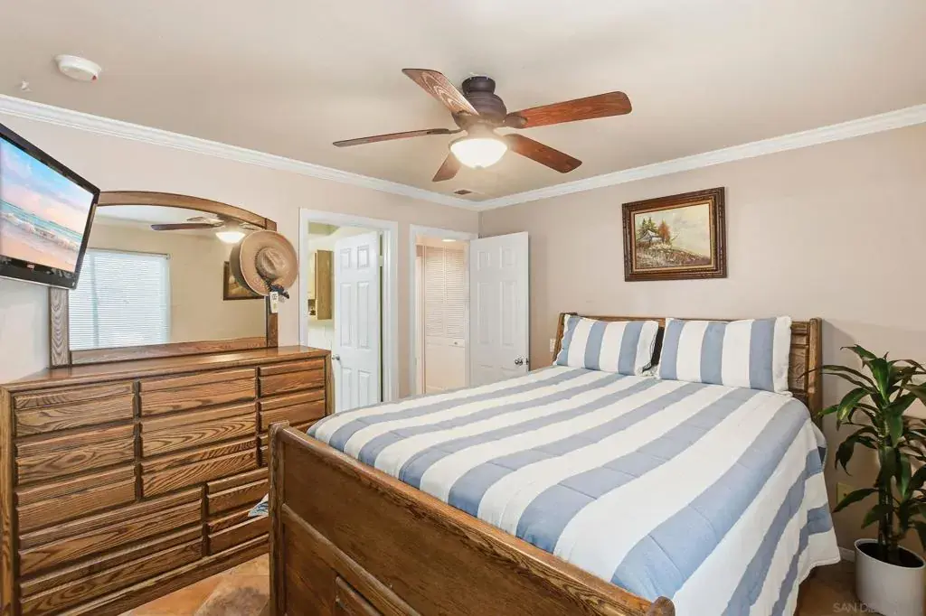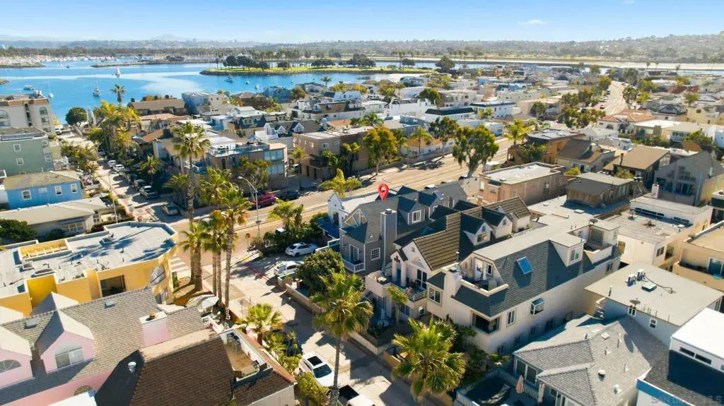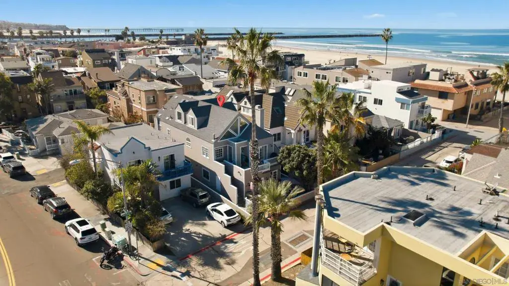 Welcome to your new beach home or ideal vacation retreat in the heart of South Mission Beach. This inviting coastal residence welcomes you through a spacious private front courtyard offering the perfect setting for outdoor dining, entertaining, or simply enjoying the vibrant people-watching. Inside, the home opens to the living/family, and dining area with tile flooring throughout. French doors connect the dining area to the courtyard, enhancing the indoor-outdoor flow. The kitchen features granite countertops, a breakfast bar, newer appliances, a five-burner gas stove with backsplash, while the dining area includes custom built-in seating along the breakfast bar with generous storage beneath, adding charm and functionality. This two-bed, two full bath layout includes a primary suite with its own bathroom, featuring custom-built overhead storage above the bedroom closet, designed to maximize space. Both bedrooms include mirrored closet doors and ceiling fans. Additional highlights include crown molding in the living room and bedrooms, six-panel interior doors, a hallway laundry closet w/stackable washer and dryer, Anderson dual-pane windows w/lifetime transferable warranty, recent interior and exterior paint and a new roof in 8/22. This home offers two off-street tandem parking spaces and exterior storage near the covered parking area. Located just steps to the Pacific Ocean, steps to the bay, a short walk to Belmont Park, restaurants, and favorites like The Beachcomber and Pennant, this home delivers a true South Mission Beach lifestyle with year-round coastal enjoyment.
