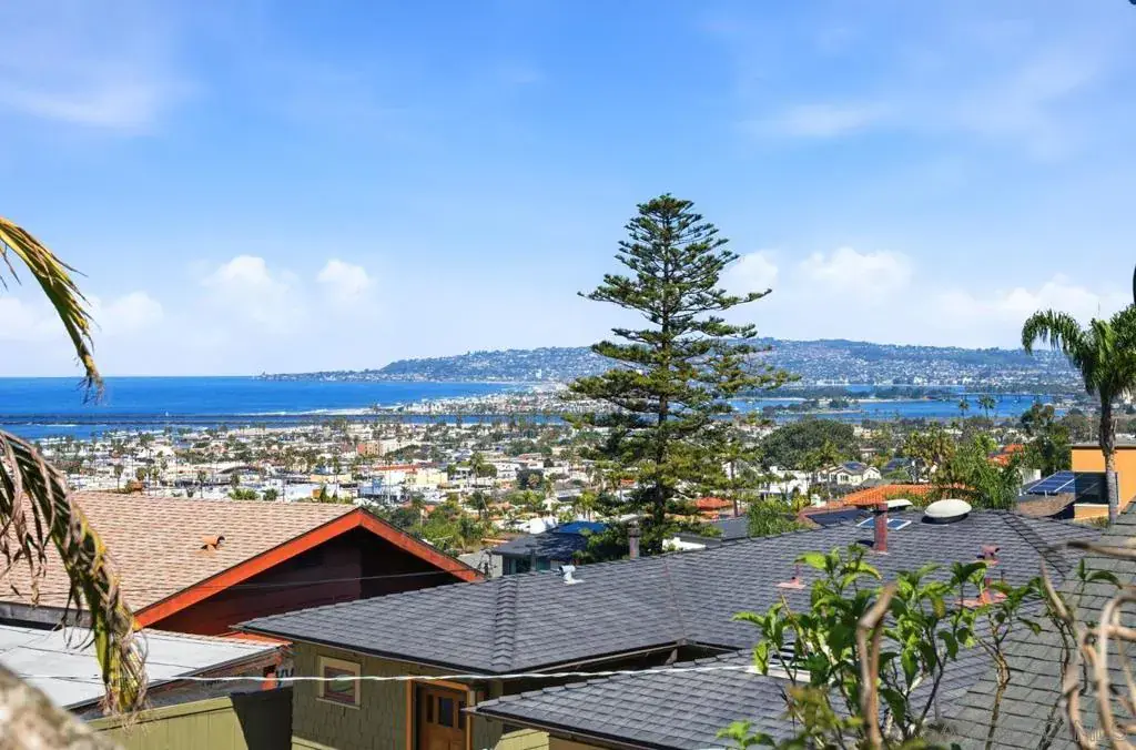 Inspired by Architect Bernard Maybeck renowned for Arts & Crafts movement in the early 1920’s, meticulously built home by contractor Mark Holmes and strategically placed on the lot to maximize the sweeping, panoramic views of OB village, whitewater view north of the Pacific coastline, to the PB north shore/LJ south shore. This 3-bedroom, 3 bath home exudes an emotional chemistry. Original home built in 1928 and seamlessly expanded and completed (according to permit records) in 2000. Current owners have lovingly maintained this jewel. Sentimentally called the ‘Pine House’ with the imposing and robust Torrey pine tree, enter this home and you are overwhelmed by the beauty of the property setting and building materials used. Note the lovely Brazilian cherry wood floors and the grand light filled rooms and open floor plan. Prominent and unique rock fireplace (with gas started) in living room with seating alcove to take in the gorgeous whitewater coastal views from OB village to La Jolla south shore. Box beamed ceilings in dining room with custom cherry wood built-in sideboard. Kitchen has double convection oven, wonderful counter space & loads of cabinetry for storage. Main floor guest bedroom has lovely window seat to gaze out to the backyard garden. As you ascend the stairs to the master the views get even better. Top floor is a wonderful kids paradise with loads of storage closets and beautiful views. Above the garage is an artist studio/office with its own wood-burning fireplace with gas jet, balcony and more whitewater views. Room Measurements: BR#2 – 1st floor guest room 12×11. BR#3 -Top floor bedroom 21×14. Extra room#1 – alcove in primary bedroom. Extra room#2 – detached office/game room over garage – 23×20.