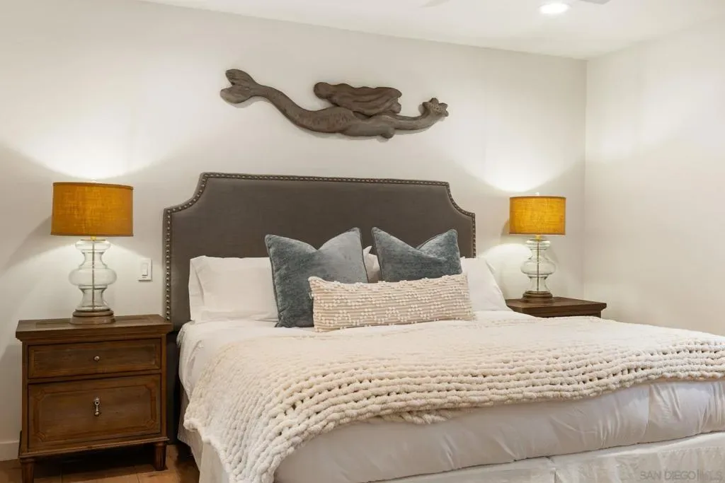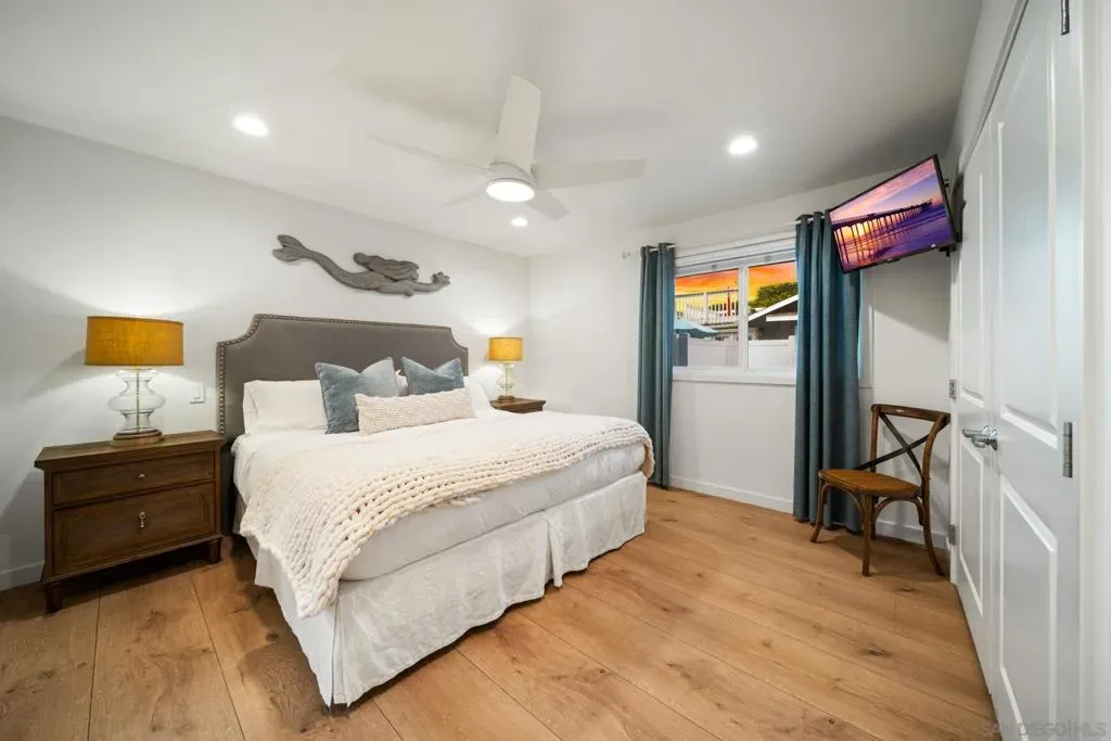 Ocean Beach Cottage with Views Just a half block from the sand and park, this charming 2BR/2BA single-level unit offers stunning ocean and pier views from the living room and front yard. Fire up the BBQ while waves crash and the sun sets over the pier. Only 2 blocks from shops, restaurants, bars, and the iconic OB Pier. Boogie boards, chairs, towels, umbrellas, and sand toys provided—everything you need for a perfect Cape Cod-style coastal getaway. This fully upgraded beach cottage features an open floor plan with fireplace, wall-mounted TV, and breakfast bar. The kitchen has stainless steel appliances, quartz countertops, and is stocked for home-cooked meals. The king bedroom has its own bath with tub, while the second bedroom offers a queen bed. A full-size pull-out sofa in the living room provides extra sleeping space. The home also has A/C, though ocean breezes and the sound of waves make opening the windows irresistible. The private front yard is ideal for morning coffee, afternoon BBQs, or simply relaxing with ocean views. The swim- and surf-friendly beach is just steps away, and the OB Pier—the longest concrete pier on the West Coast—is perfect for scenic walks, fishing, or dining. Tide pools below the pier are great for exploring. One of four units in the building, this cottage is perfect for couples, families, or groups needing multiple rentals. STR-11195L | TOT-617561