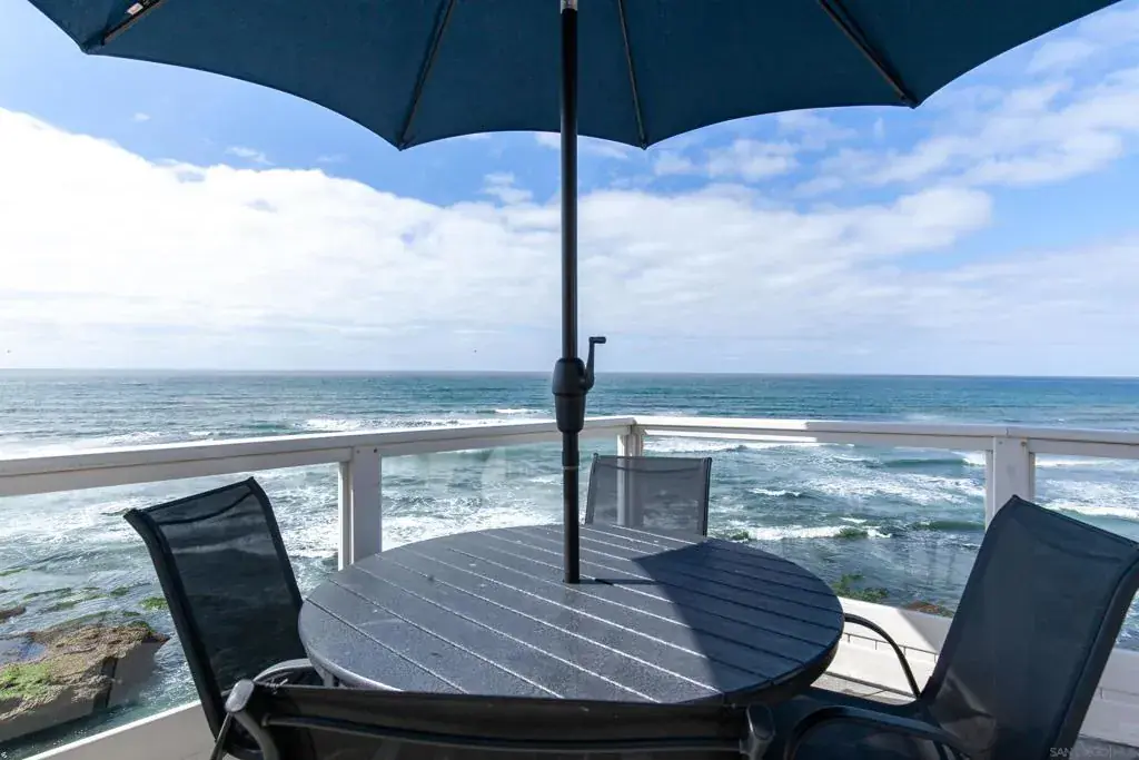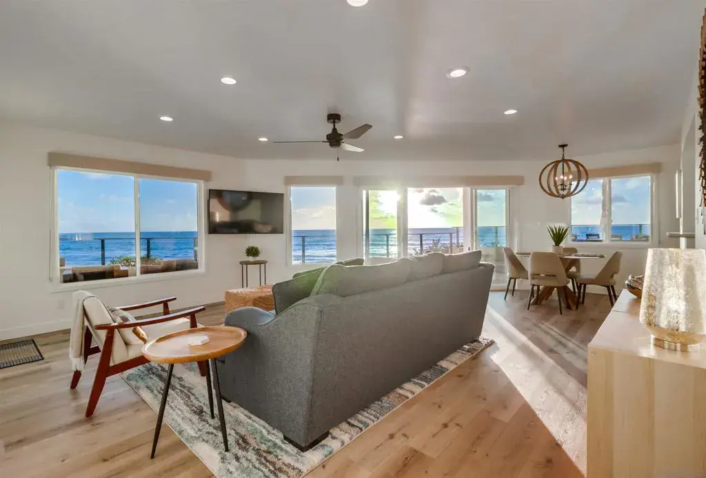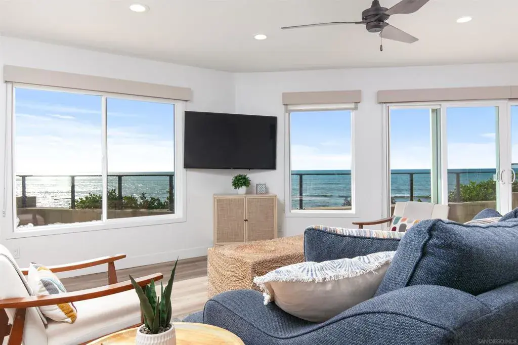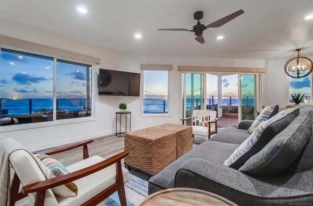 Rare true oceanfront income property in Sunset Cliffs with sweeping ~280° sit-down ocean views, exceptional privacy, and beautifully renovated, turn-key interiors. Includes four upgraded 2BR residences plus two well-finished bonus studio units, offering excellent flexibility and income potential. Renovations from 2020–2025 include quartz counters, stainless appliances, LVP flooring, updated baths, dual-pane windows, and cohesive coastal-modern finishes. Three residences perform strongly as VRBO short-term rentals, while the remaining units are month-to-month long-term rentals with significant upside. Additional highlights: rare 4-car garage, new garage doors, new staircases, and multiple ocean-facing decks/patios. The renovation included major permitted improvements, expanded living areas, and comprehensive upgrades to core systems including HVAC with central air conditioning, plumbing, and electrical, along with a newly rebuilt garage and additional finished living space above. Multiple outdoor decks were created to maximize panoramic views, including decks off the primary suite, living area, and the library/bedroom suite above the garage. The kitchen is appointed with a full Thermador suite including refrigerator/freezer columns, wine refrigerator, double ovens, and a 6-burner range with griddle and pot filler, plus a large granite waterfall island with seating for five. Decking is Trex with updated iron railings, and the patio is plumbed for gas for a future fire feature. The primary suite features Italian Carrara marble finishes, dual sinks, separate water closet, walk-in closet and additional closet storage, and the primary bath and powder room are equipped with bidets. The lower level functions as a true guest suite with a spacious family room, full kitchenette, separate entry, laundry, large closets, plus a private bedroom and full bath.