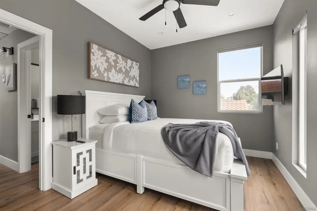 FURNISHED MIDTERM & LONG-TERM RENTAL — Brand New Coastal Contemporary in Pacific Beach Newly built 2BR / 1.5BA coastal contemporary home just four blocks from Law Street Beach in the heart of North Pacific Beach. Walkable to cafés, shopping, and vibrant dining, this stylish retreat offers fresh design and relaxed beachside living. Gated front yard features a pergola, cozy outdoor seating, market lights, and BBQ for alfresco evenings. Inside, the spacious living room includes a large sectional, flatscreen TV, and dedicated workspace. Open floor plan flows to the dining area for four and a modern kitchen with stainless steel appliances. Convenient half bath on the main level. Upstairs, both bedrooms offer queen beds; one includes a desk, the other a flatscreen TV and ceiling fan. Updated full bath with shower/tub combo completes the layout. A/C provided for year-round comfort. North Pacific Beach offers calm, family-friendly beaches, scenic cliffside viewpoints, surf schools, the boardwalk, and easy access to Tourmaline Surf Park and Crystal Pier. Sleeping Setup (max 4): BR1 Queen • BR2 Queen 1 Full Bath + 1 Half Bath Available fully furnished only. Rates reflect short-term rental pricing and vary by season and length of stay. Published amounts are estimates; final pricing, fees, and availability are subject to change until a signed agreement. Please inquire for an exact quote.