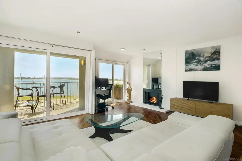 WATERFRONT unit on Sail Bay!!. Gorgeous south-facing, corner unit on the sand!! Wake up to unobstructed, sparkling bay views on Sail Bay boardwalk. This rare waterfront unit offers panoramic bay views, steps from the sand. It has not been on the market for over 30 yrs and has the best location in the project. This 2nd floor unit allows for privacy but still lets you check out all the action on the boardwalk. Unit also sides to Fanuel Park, offering additional open, green space views. This is permanent vacation living. Large, one bedroom unit that has tons of natural light, has been updated and is in move-in condition. Features include newer kitchen appliances, gas fireplace, breakfast bar, track lighting, floor to ceiling windows, hardwood and tile flooring, mirrored wardrobe doors, custom California Closet organized closets. This project is approved for short term rentals and would make an awesome AirBNB. Unit comes with one assigned underground parking space and large storage unit. Project amenities include a large spa, common laundry room & board storage. Ample guest parking at adjacent Fanuel Park. Enjoy morning coffee watching boats drift by on your private balcony & evening lights shimmering across the water, with all the energy of PB just steps away—beaches, dining, and nightlife!