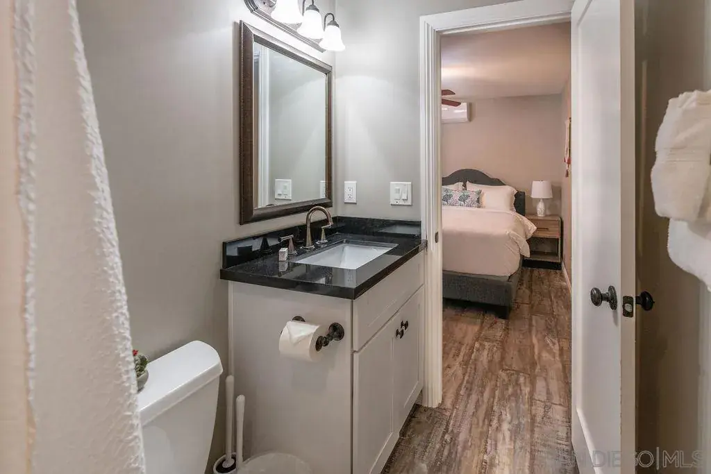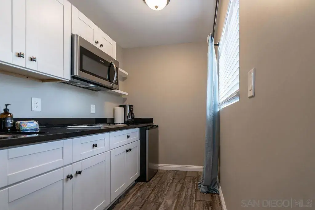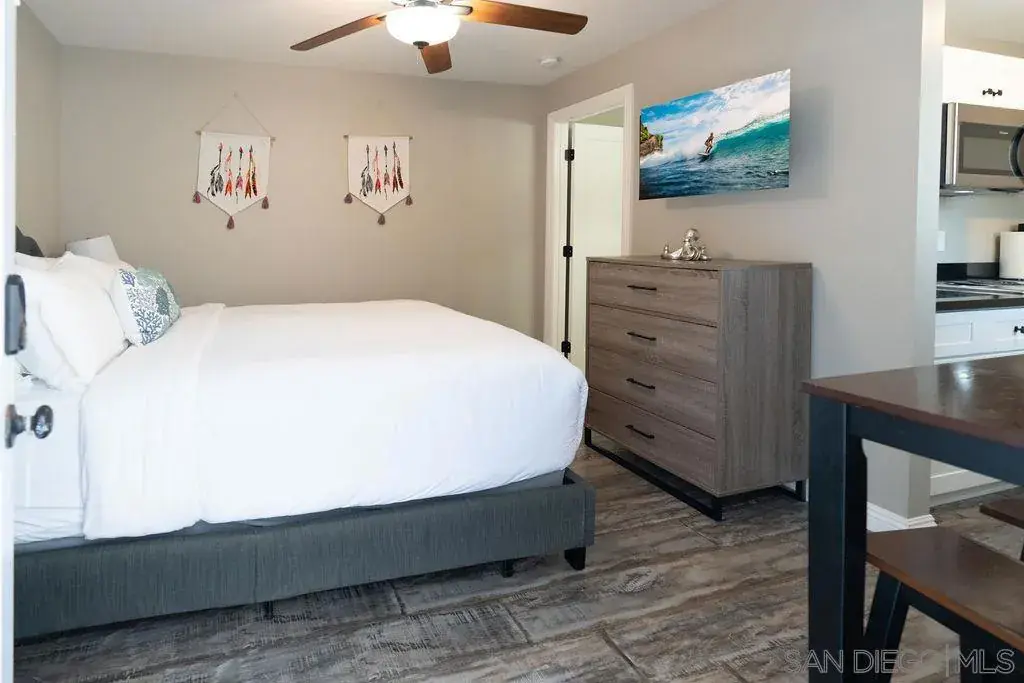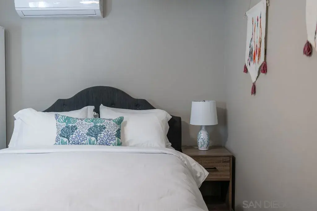 Surfside Studio, Steps to Ocean, Adorable remodeled studio, walking distance to the ocean in beloved, Pacific Beach! Experience the charm of our beachside haven while making unforgettable memories in this tranquil and inviting setting! Please note: this is a true studio with no separate bedroom.Highlights of this cozy abode include a comfortable queen bed, a ceiling fan and A/C to keep you refreshed, small high-top table with 2 stools, plus a flat-screen, Smart TV to watch your favorite movies and shows. You’ll appreciate the sleek kitchenette, complete with a mini refrigerator, 2-burner stove, microwave, and coffee maker. Freshen up in the combo tub/shower after a day at the beach or exploring the nearby attractions. Right outside your door, you’ll discover a small patio area with a bistro table with seating for two. There is also an outdoor BBQ and a stacked washer and dryer on-site for your convenience. We understand that pets are part of the family, so feel free to bring your furry friends along for the adventure. This studio is within walking distance to the beach, so you can easily spend your days lounging in the sun, swimming in the ocean, or taking romantic sunset strolls along the shoreline. Sleeping Accommodations (Maximum 2 guests): Studio: 1 Queen Bed Pets ok with approval and pet fee applied. Guests will have access to the entire studio, but please note there are other units on the property. You can also rent each unit separately or together as a compound. 30 day minimum rental.