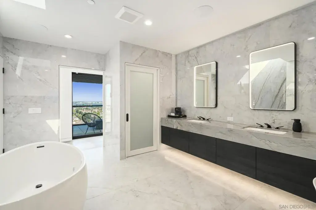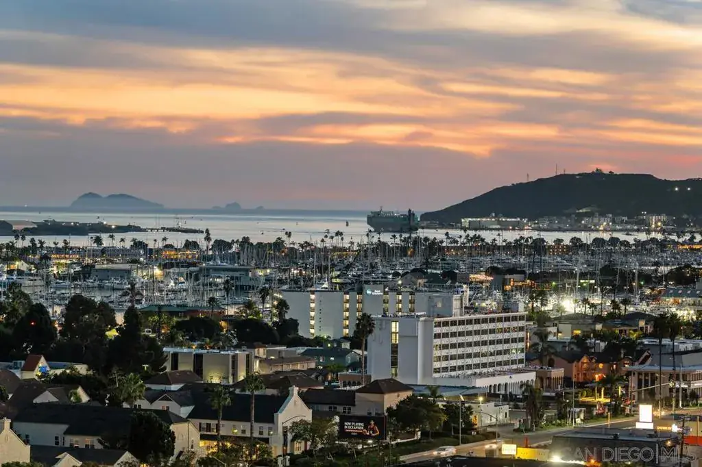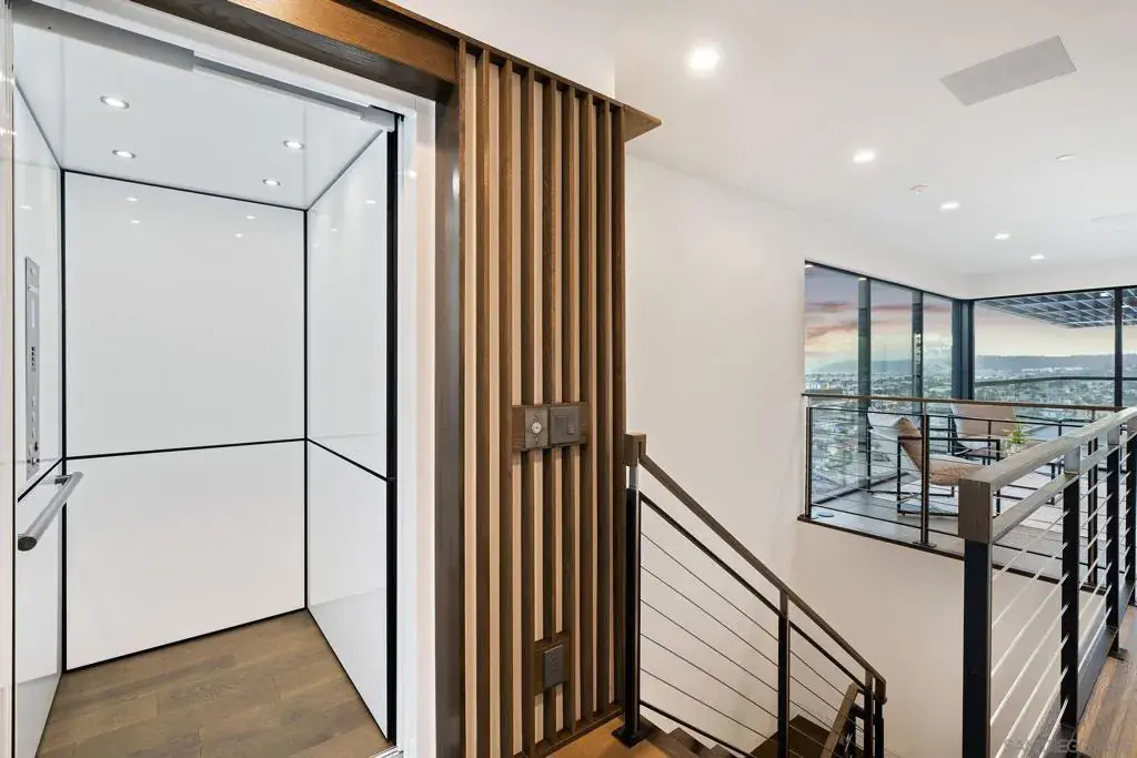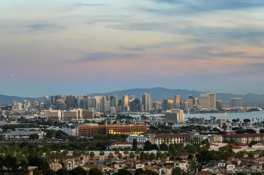 Introducing this one of a kind striking California modern masterpiece envisioned by local architect Daniel Geiger, AIA. This extraordinary residence blends architectural artistry with everyday livability, offering an unmatched fusion of luxury, function, and effortless entertainment. Crafted with low-maintenance, modern materials, the home’s bold exterior pairs crisp white plaster with walnut-toned accents, exposed structural steel, and expansive glass walls. The result is a visually dynamic façade that frames a curated journey through panoramic views of the San Diego skyline—an immersive architectural experience as much as a home. Step inside from the third-floor foyer and be instantly captivated by sweeping bay vistas and an abundance of natural light, softly diffused by a louvered canopy above the primary suite’s balcony. The primary retreat is nothing short of a sanctuary: a private haven with commanding views of the downtown skyline and bay, and a cantilevered terrace complete with a fire pit—perfect for serene evenings under the stars. The spa-inspired primary bath is a luxurious escape, featuring heated floors, a steam-equipped shower, a sculptural freestanding tub with uninterrupted views, and a spacious custom walk-in closet. Movement through the home is guided by a show-stopping stairwell with waterfall-edge treads and a sleek mixed-metal handrail. A thoughtfully integrated finely appointed elevator adds both refinement and convenience, effortlessly connecting all levels. On the main floor, a dramatic open-plan living area takes center stage. Towering 13-foot Fleetwood sliding glass doors open wide to a vast cantilevered terrace, dissolving the boundary between indoor and outdoor living. Here, enjoy unobstructed, jaw-dropping views of downtown San Diego, the bay, Coronado, and even Mexico on the horizon. The chef’s kitchen is equipped with top-tier appliances and thoughtful design details: custom cabinetry, a 6-burner Wolf rangetop with griddle, panelized Miele dishwasher, Sub-Zero side-by-side fridge and freezer, and a discreet walk-in pantry. Nearby outdoor spaces feature a built-in BBQ station nestled against a dramatic wood grain board-formed concrete wall and a buffet-sized natural quartzite serving counter perfect for outdoor entertaining. The home features four spacious bedrooms, a media room, a family room, a living room, and three and a half impeccably appointed bathrooms—each crafted with its own character, blending elevated design with warm functionality. This is more than a residence—it’s a living work of art, designed for those who appreciate bold architecture, sophisticated luxury, and unforgettable views. Welcome to your front-row seat to San Diego’s skyline.