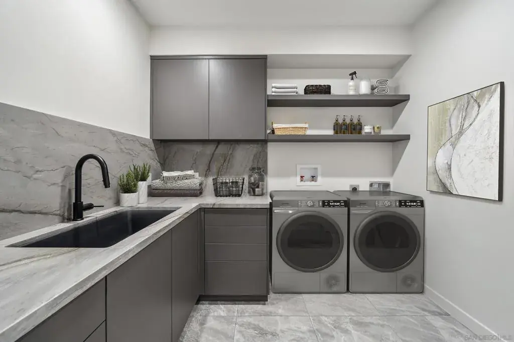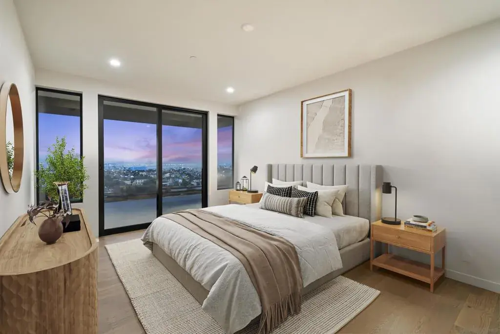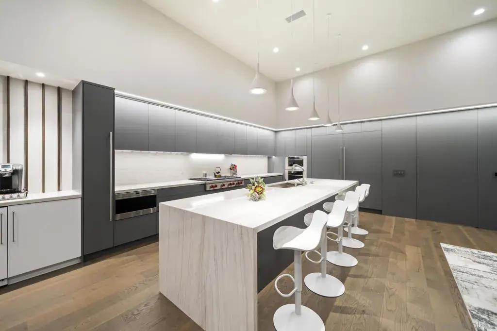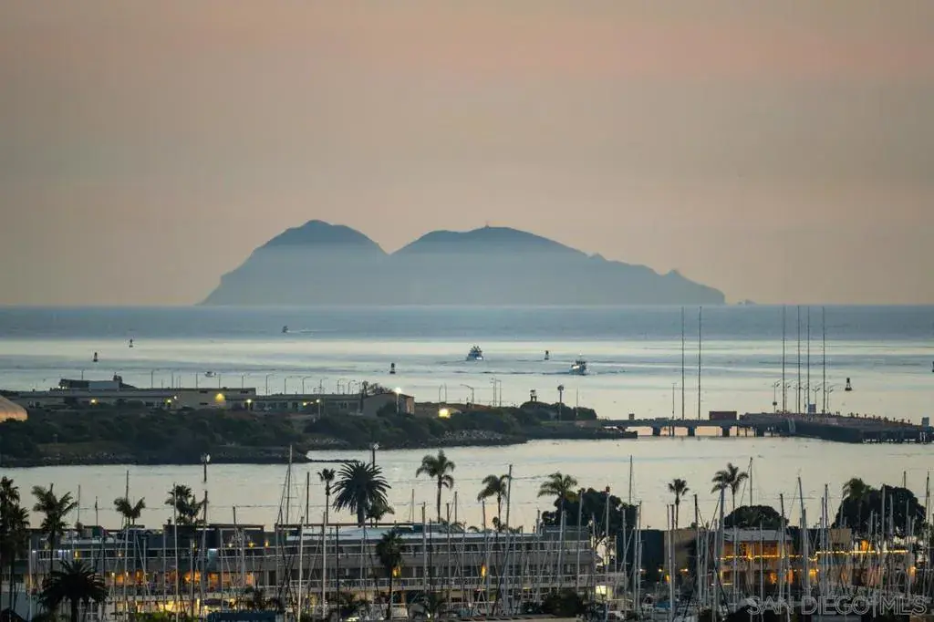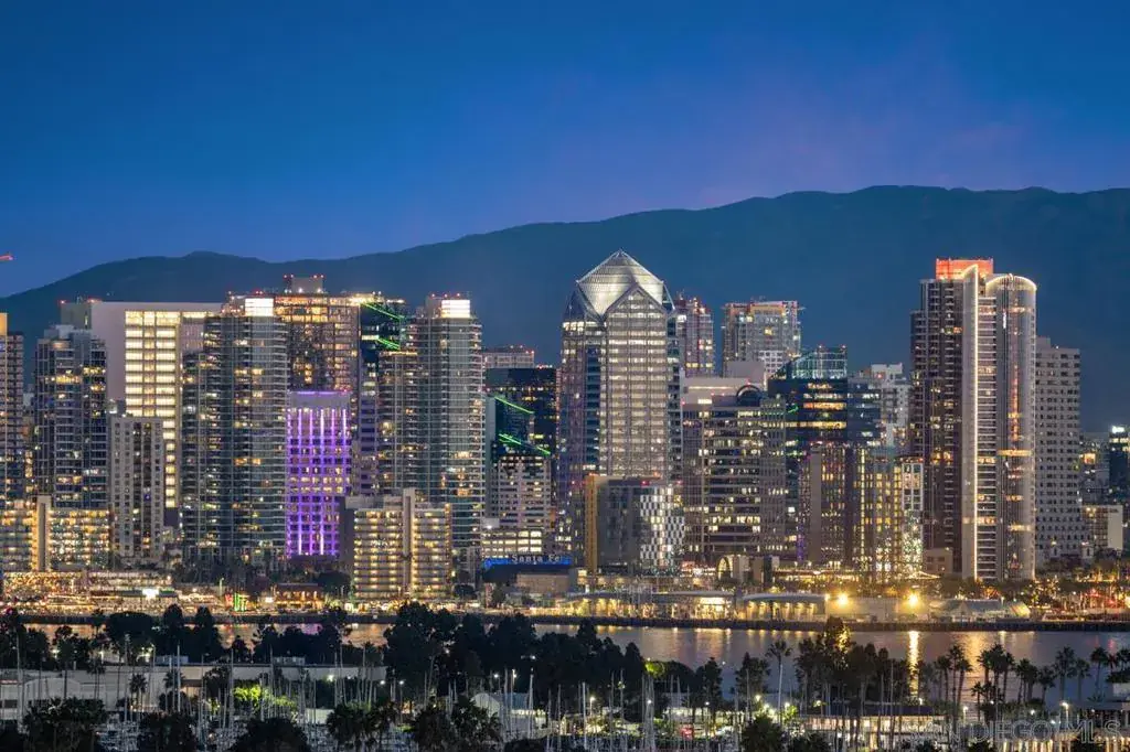 Introducing this one of a kind striking California modern masterpiece envisioned by local architect Daniel Geiger, AIA. This extraordinary residence blends architectural artistry with everyday livability, offering an unmatched fusion of luxury, function, and effortless entertainment. Crafted with low-maintenance, modern materials, the home’s bold exterior pairs crisp white plaster with walnut-toned accents, exposed structural steel, and expansive glass walls. The result is a visually dynamic façade that frames a curated journey through panoramic views of the San Diego skyline—an immersive architectural experience as much as a home. Step inside from the third-floor foyer and be instantly captivated by sweeping bay vistas and an abundance of natural light, softly diffused by a louvered canopy above the primary suite’s balcony. The primary retreat is nothing short of a sanctuary: a private haven with commanding views of the downtown skyline and bay, and a cantilevered terrace complete with a fire pit—perfect for serene evenings under the stars. The spa-inspired primary bath is a luxurious escape, featuring heated floors, a steam-equipped shower, a sculptural freestanding tub with uninterrupted views, and a spacious custom walk-in closet. Movement through the home is guided by a show-stopping stairwell with waterfall-edge treads and a sleek mixed-metal handrail. A thoughtfully integrated finely appointed elevator adds both refinement and convenience, effortlessly connecting all levels. On the main floor, a dramatic open-plan living area takes center stage. Towering 13-foot Fleetwood sliding glass doors open wide to a vast cantilevered terrace, dissolving the boundary between indoor and outdoor living. Here, enjoy unobstructed, jaw-dropping views of downtown San Diego, the bay, Coronado, and even Mexico on the horizon. The chef’s kitchen is equipped with top-tier appliances and thoughtful design details: custom cabinetry, a 6-burner Wolf rangetop with griddle, panelized Miele dishwasher, Sub-Zero side-by-side fridge and freezer, and a discreet walk-in pantry. Nearby outdoor spaces feature a built-in BBQ station nestled against a dramatic wood grain board-formed concrete wall and a buffet-sized natural quartzite serving counter perfect for outdoor entertaining. The home features four spacious bedrooms, a media room, a family room, a living room, and three and a half impeccably appointed bathrooms—each crafted with its own character, blending elevated design with warm functionality. This is more than a residence—it’s a living work of art, designed for those who appreciate bold architecture, sophisticated luxury, and unforgettable views. Welcome to your front-row seat to San Diego’s skyline.