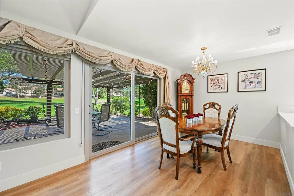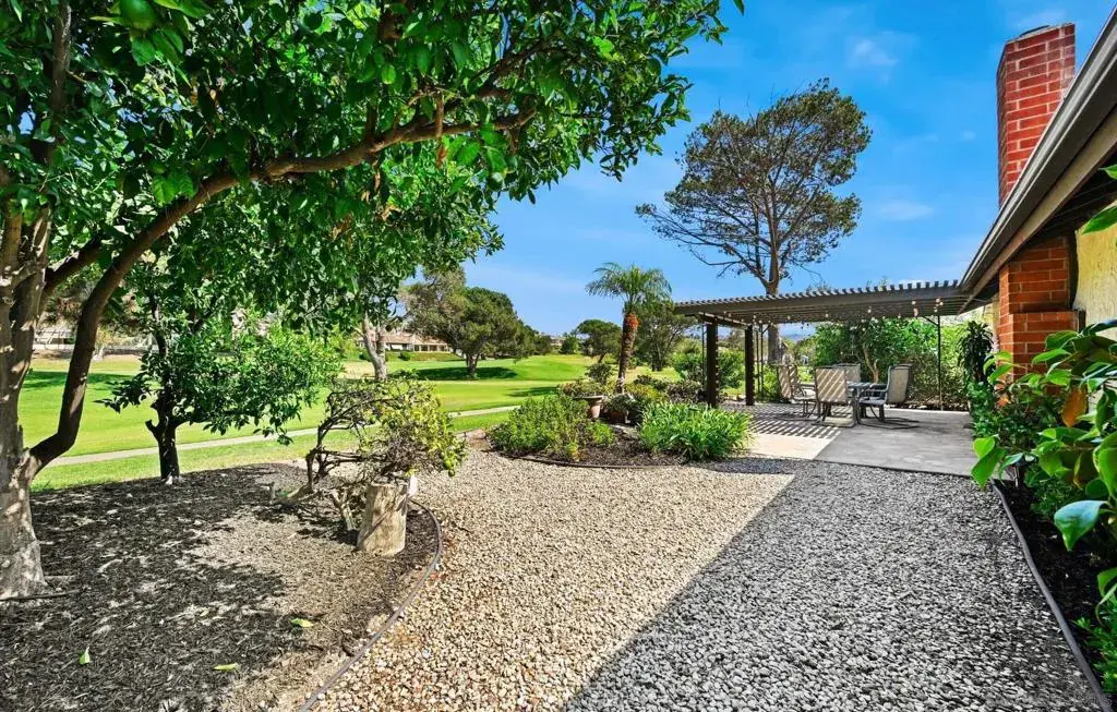 Premium location situated directly on the beautiful Oaks North Golf Course, this single-story home offers panoramic golf course views on a quiet cul-de-sac in the highly desirable 55+ Oaks North neighborhood. Enter and gaze upon soaring high vaulted ceilings, open floor plan with lots of light creates an inviting atmosphere. Recent renovations include a gorgeous open kitchen with quartz countertops, stainless steel Thermador appliances, garden window, bar seating, nook and formal dining areas. A spacious living room with a fireplace is ideal for relaxing or entertaining. Upgrades also include luxury vinyl plank flooring, recessed lighting, HVAC system, water heater and quartz countertops in the primary bathroom, secondary bathroom and hallway cabinet, the primary bathroom also showcases a walk-in shower with stone-look tile and pebble accents. Meander outside to a generous patio with a new aluminum pergola—perfect for relaxing, dining, or entertaining while taking in the serene golf course scenery. The easy care yard has a bounty of fruit trees including Valencia orange, grapefruit and lemon. Additional highlights include an indoor laundry (washer/dryer included) and attached 2-car garage. Residents of Oaks North enjoy access to the Oaks North Community Center offering multiple social and recreation activities including a community pool, tennis courts, pickleball, lawn bowling, exercise room, billiards, library etc. With close proximity to the Rancho Bernardo Inn, Bernardo Winery, golf courses, shopping, and dining, this home truly has it all!