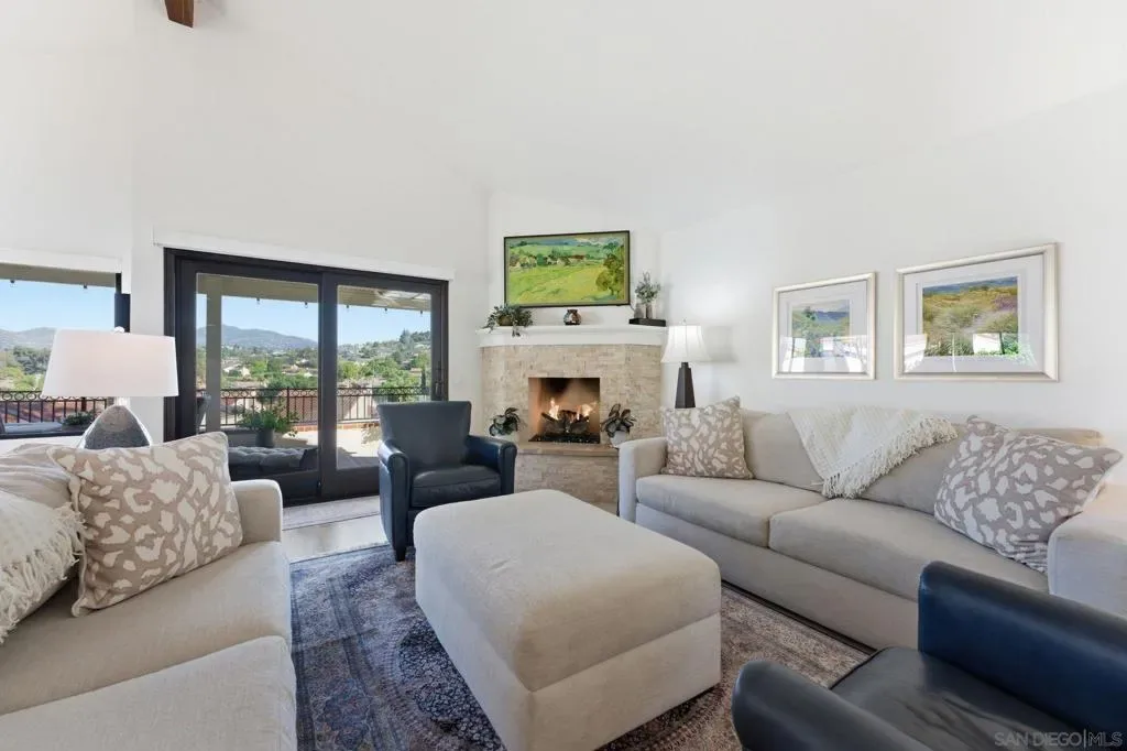 Perched on a scenic hilltop in the gated community of Chapala, this beautifully upgraded home offers breathtaking views of the surrounding mountains, sparkling evening lights, & the Oak North Golf Course through expansive wall-to-wall doors & windows. This light-filled two-bedroom, two-bath residence features soaring vaulted ceilings & an open-concept layout designed for comfortable living & effortless entertaining. The spacious living room is highlighted by a stylish stacked-stone corner fireplace & flows seamlessly into the dining area & updated kitchen. Neutral luxury wide-plank vinyl flooring & carpeting, creating a clean, modern feel. The open kitchen is a standout feature, offering crisp white shaker cabinetry, elegant quartz countertops, stainless steel appliances, gas cooking, & a large island with table seating—perfect for casual meals or gathering with guests. Paid Solar installed. Perched on a scenic hilltop in the gated community of Chapala, this beautifully upgraded home offers breathtaking views of the surrounding mountains, sparkling evening lights, & the Oak North Golf Course through expansive wall-to-wall doors & windows. This light-filled two-bedroom, two-bath residence features soaring vaulted ceilings & an open-concept layout designed for comfortable living & effortless entertaining. The spacious living room is highlighted by a stylish stacked-stone corner fireplace & flows seamlessly into the dining area & updated kitchen. Neutral luxury wide-plank vinyl flooring & carpeting, creating a clean, modern feel. The open kitchen is a standout feature, offering crisp white shaker cabinetry, elegant quartz countertops, stainless steel appliances, gas cooking, & a large island with table seating—perfect for casual meals or gathering with guests. Step outside to the oversized back patio, an ideal space for entertaining, dining outdoors, or simply relaxing while taking in the peaceful hillside setting and sweeping golf course views. Located in the highly desirable Chapala neighborhood of Oaks North, residents enjoy a quiet gated setting with convenient access to golf, shopping, dining, and the Oaks North Community Center amenities. This move-in-ready home combines comfort, style, and exceptional views in one of North County’s most sought-after 55+ communities. Over $150,000 in recent upgrades, including paid Solar