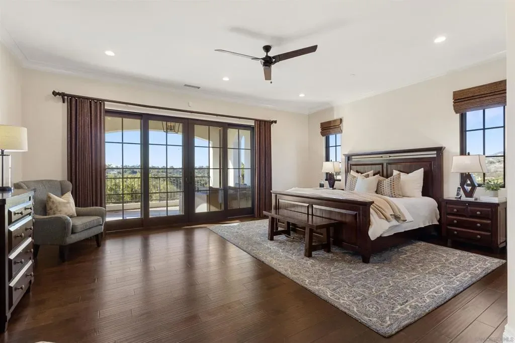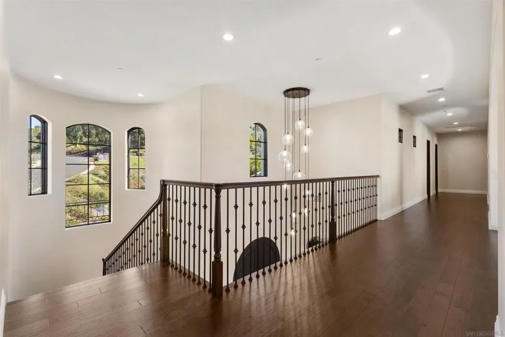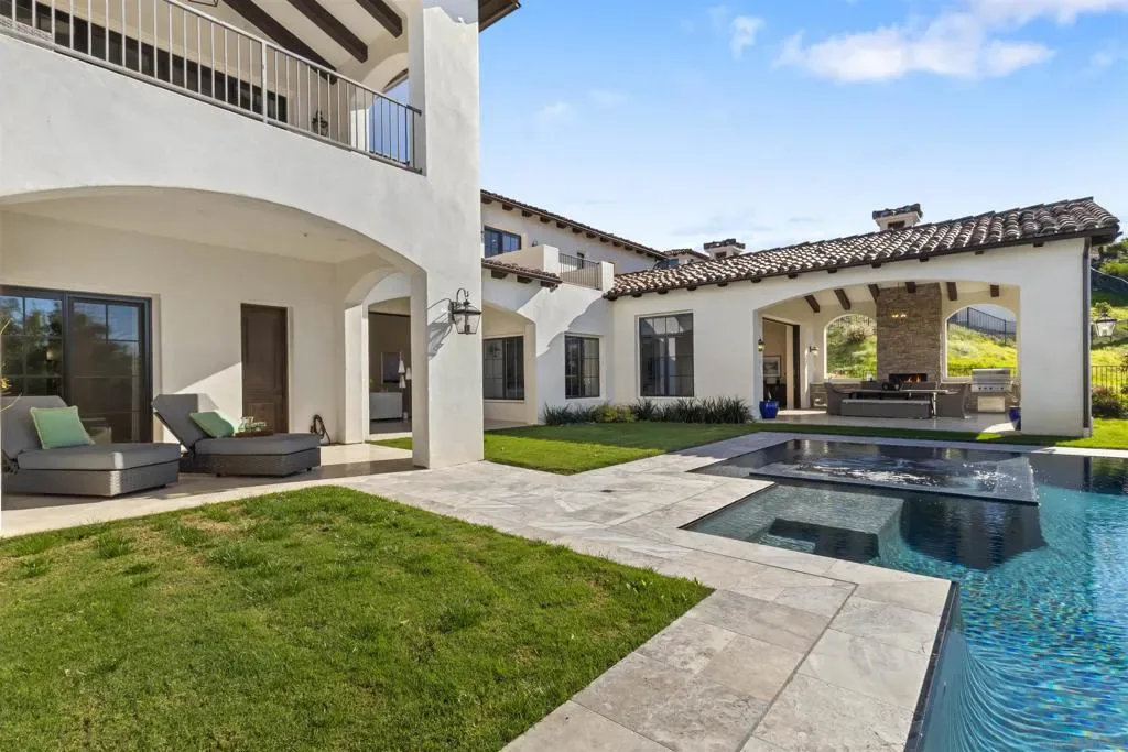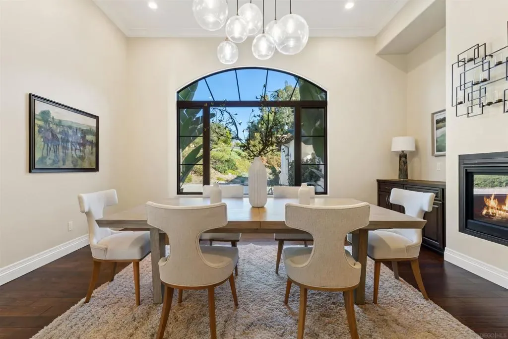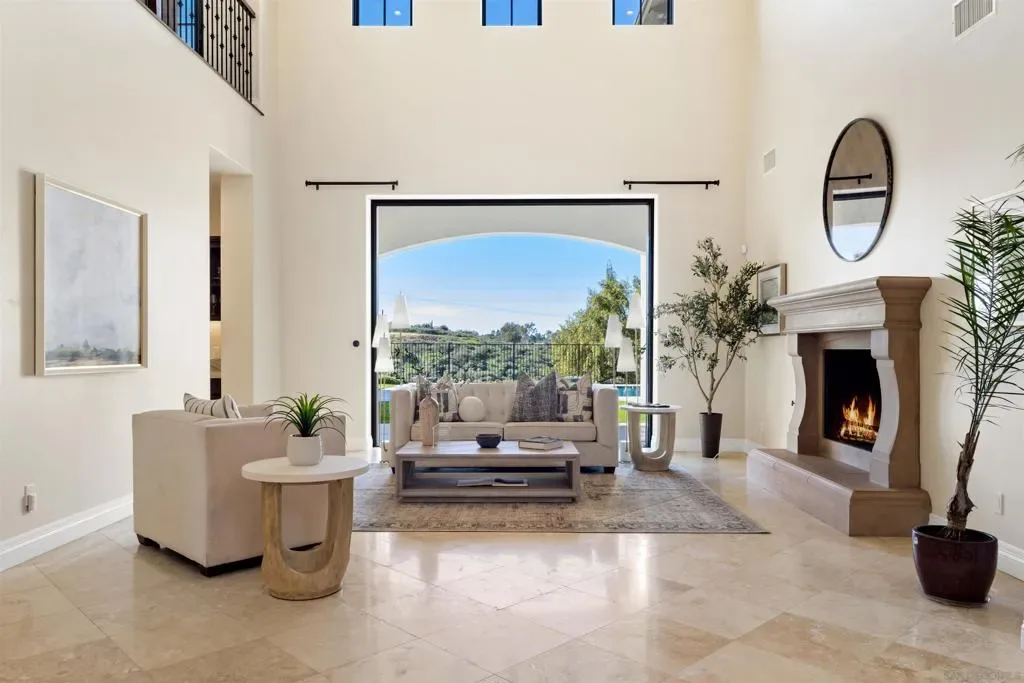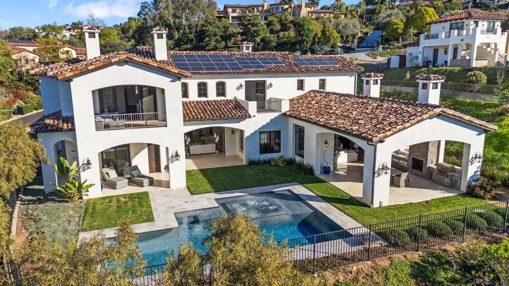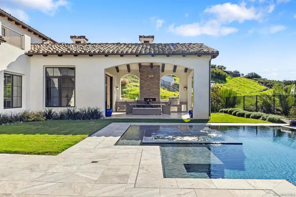 Absolutely stunning custom estate completed in 2022—among the newest homes in the prestigious Crosby at Rancho Santa Fe. Ideally located on a quiet, beautifully curated street of luxury residences within the highly rated Solana Santa Fe (K–8) and Torrey Pines High School districts, and near top private academies. Designed by local architect Scott Grunst, this 6,523 sq. ft. residence blends timeless elegance with modern luxury. A dramatic 22-foot foyer sets the tone with soaring arched windows, hardwood floors, exposed solid wood beams, and a grand staircase with wrought-iron railings. The chef’s kitchen is equipped with an eight-burner Wolf range with infrared charbroiler, 64″ Electrolux refrigerator/freezer, double Electrolux dishwashers, custom stained alder cabinetry, and Brazilian quartzite countertops. Entertain effortlessly with a full wet bar featuring a built-in kegerator and a custom, climate-controlled 800-bottle wine cellar with additional storage. Disappearing pocket doors create seamless indoor-outdoor living, opening the main living space to a covered loggia with fireplace, full outdoor kitchen, and Wolf BBQ. The resort-style backyard offers exceptional privacy with no close neighbors and showcases a rim-flow PebbleTec® pool, vanishing-edge spa, raised fire pits, and unobstructed sunset views over a protected natural preserve. The thoughtful floor plan includes an elegant executive office on the main level with built-ins and fireplace, a main-level guest or secondary primary suite ideal for multigenerational living, and a spacious upstairs primary retreat. Upstairs also features two additional ensuite bedrooms and a game room overlooking the living room below. Additional highlights include an owned solar system, oversized motor court, and a four-car garage configuration: attached two-car garage with Tesla charger plus a detached, insulated two-car garage with A/C wiring—ideal for a gym, studio, or yoga space. Residents enjoy access to The Crosby’s Fred Couples-designed golf course, 35,000-sq.-ft. clubhouse, tennis and pickleball courts, Olympic-size pool, spa, fitness center, dining, and active social calendar. Conveniently located with quick access to Rancho Santa Fe Village via the north gate and Hwy 56, Hwy 15, and Hwy 5 via the south gate for beaches, shopping, and dining.