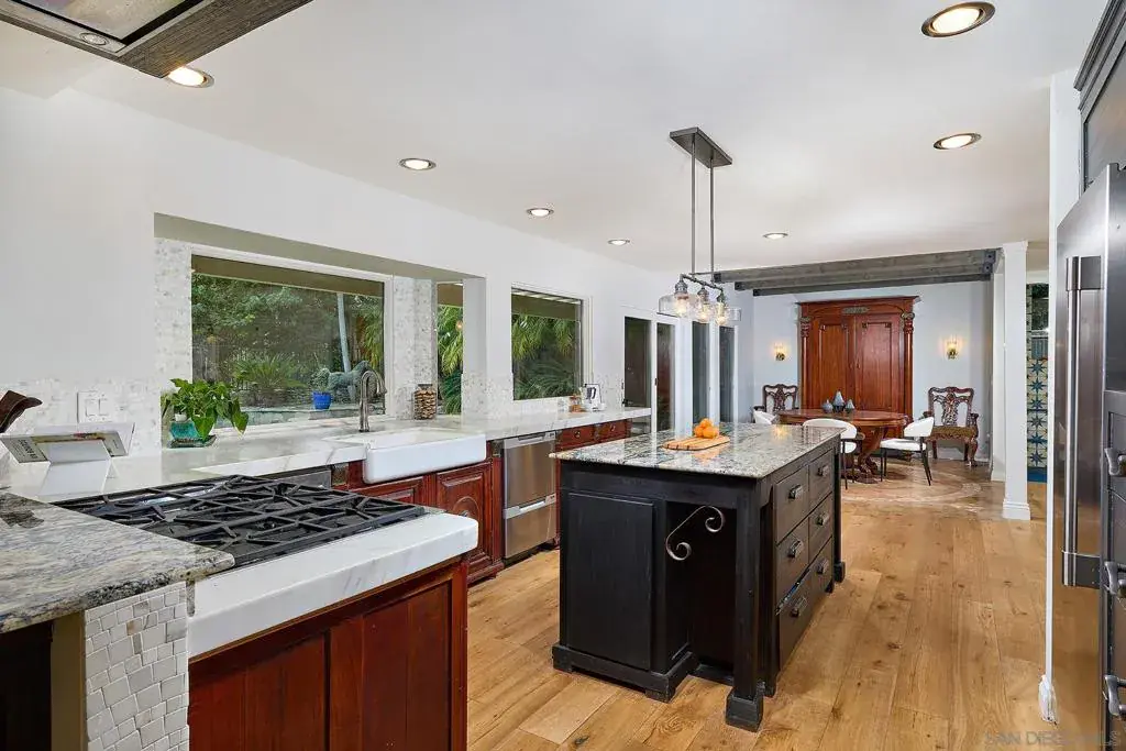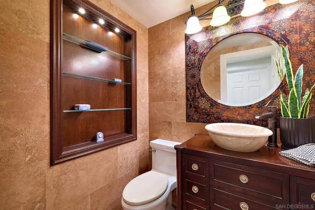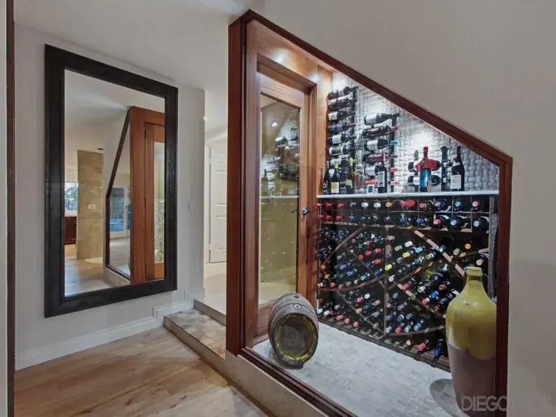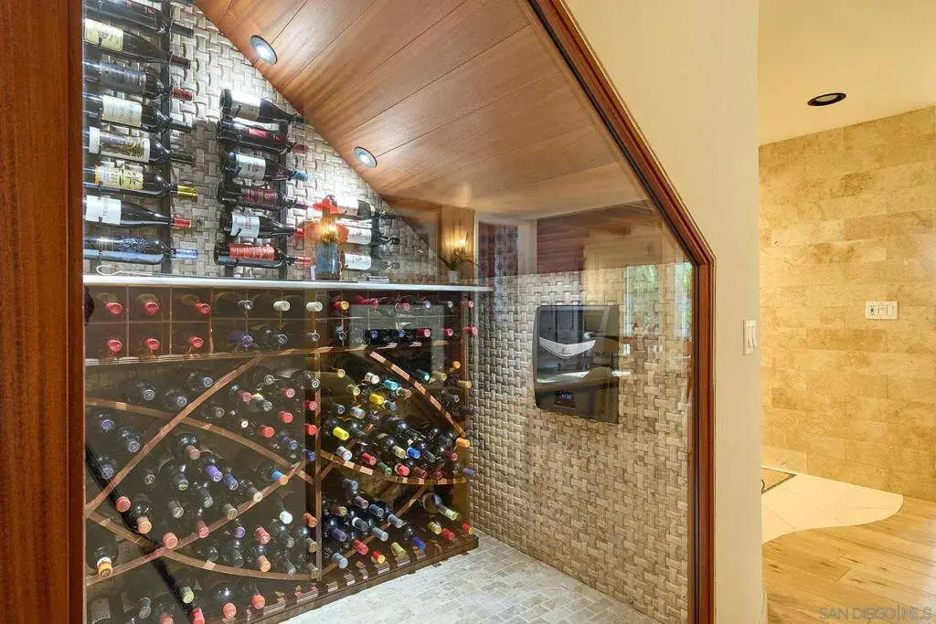 Curated semi-custom home on a serene cul-de-sac. An entertainer’s vision has come to life in this home—large open gathering rooms, a kitchen with luxurious appliances, exceptional backyard amenities, impressive wine storage, and owned solar! Bedroom on the first level, a lift/elevator to the second floor-a rare feature! Every element has been intentionally selected; nothing overlooked, nothing ordinary. This residence is for those with a discerning eye and a lifestyle that calls for something truly above and beyond. Ideal for unforgettable celebrations, your circle will undoubtedly jump at the chance to attend. Striking double glass front door, and rich travertine and hardwood floors set the tone for this one-of-a-kind architectural gem. Big, open, and bright layout. Furniture-style kitchen cabinetry is one of a kind. The refrigerator and freezer are separate, offering prime space. Marble counters and backsplash are uniquely designed and beautiful. Large island and an additional prep sink area. Dacor 6-burner cooktop and double-door/use dishwasher. This is a dream kitchen! Family room features a gorgeous wood and stacked stone fireplace, while a custom, climate-controlled wine room adds a unique touch. The entry-level bedroom has a set of French doors, creating a private entrance. The primary suite offers a deck, office space, and a spa-style bathroom with heated marble floors, dual-vessel sinks, and a river-rock walk-in shower. Two balconies provide additional space for the primary and a secondary bedroom. Outside is an entertainer’s dream: pool with Baja shelf, huge covered area and pergola, pizza oven, smoker, BBQ, putting green, and a walk-through large storage shed. Best of all, an owned solar system that will save you $$$. Every detail has been considered with a designer’s eye and a contractor’s touch. Do not miss your opportunity to own this “One-of-a-Kind” Gem in Scripps Ranch.