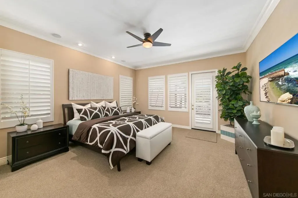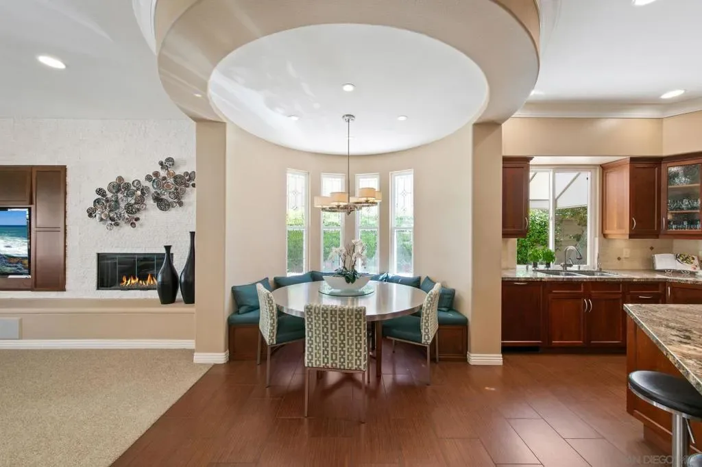 High-design single-story home located on a cul-de-sac in The Arbors, south of Pomerado in Scripps Ranch. This residence features soaring ceilings, open-concept living, and extensive custom upgrades throughout. Grand double-door entry opens to a spacious interior with wood-look tile flooring, formal living and dining areas, custom built-ins, and 2 fireplaces. The chef’s kitchen includes custom solid cherry wood cabinetry, granite countertops, 6-burner gas range, double ovens, warming drawer, built-in refrigerator, microwave, wine fridge, and banquette seating, opening to an expansive family room with built-in media center. The primary suite offers blackout shades, spa-style bath with jetted and heated tub, custom cabinetry, brass fixtures, walk-in closet, and pocket door for privacy. The additional two bedrooms are generously sized, one with an ensuite bathroom. The fourth bedroom is thoughtfully designed as a sophisticated office. Resort-style backyard with outdoor kitchen, covered dining area, fireplace, and covered/enclosed spa with pool heater, plus mature citrus trees. Upgrades include owned solar, dual-zone HVAC (2 A/C units), new tankless water heater, new soft water system, reverse osmosis water system and backyard sound system, crown molding, and custom wood shutters. 3-car garage. Prime location near top-rated schools, parks, shopping, and I-15 access.