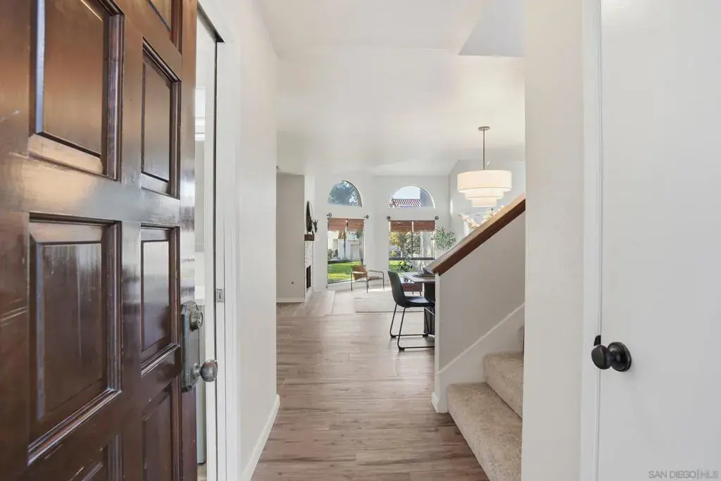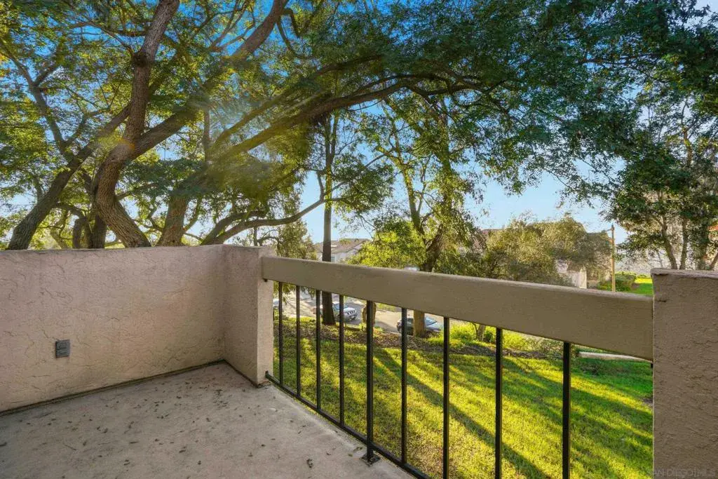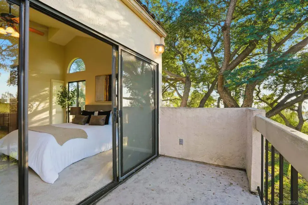 Discover modern elegance in this beautifully updated 1,913 sq. ft. residence located in the desirable Villa Dominique View Homes of Tierrasanta. Featuring 2 bedrooms, plus loft, and 2.5 bathrooms, this home has been mindfully maintained with a newer roof, fresh paint, and a gourmet kitchen remodel completed in 2020 featuring granite counters, new cabinetry, and stainless steel appliances. The interior makes a striking impression with 20ft high ceilings and an open-flow design highlighted by a stacked stone fireplace and wood-look porcelain tile flooring. A versatile primary suite includes an additional vaulted ceiling and a dedicated loft/office space, a wet bar, and a private balcony, while the main level opens to a patio off the family room for seamless indoor-outdoor living and a striking Westerly view. High-end details abound, including brand-new carpet, elegant chandeliers, and a reverse osmosis water filtration system. This FHA and VA-approved property offers the security of a 2-car attached garage with direct entry and access to a community pool and spa. Situated in a quiet building of only four units, this turnkey home perfectly balances architectural character with contemporary luxury in a prime San Diego location with access to 8000 acres of Mission Trails Region Park just steps from the front door.