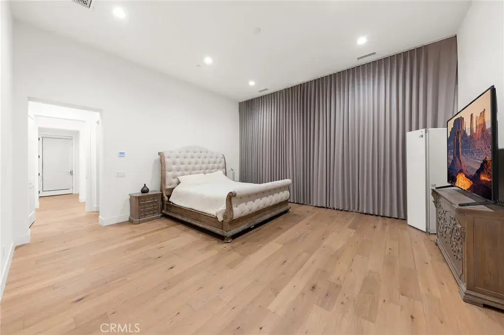 The luxurious primary suite serves as a private sanctuary, distinguished by an impressive 14-foot-high ceiling, generous proportions, and refined finishes. The spa-inspired primary bathroom evokes a five-star retreat with dual vanities, a freestanding soaking tub, a walk-in shower, and sophisticated modern details.