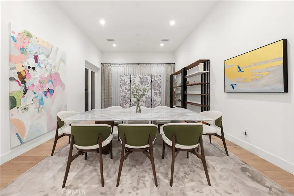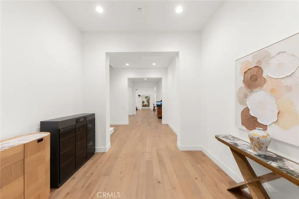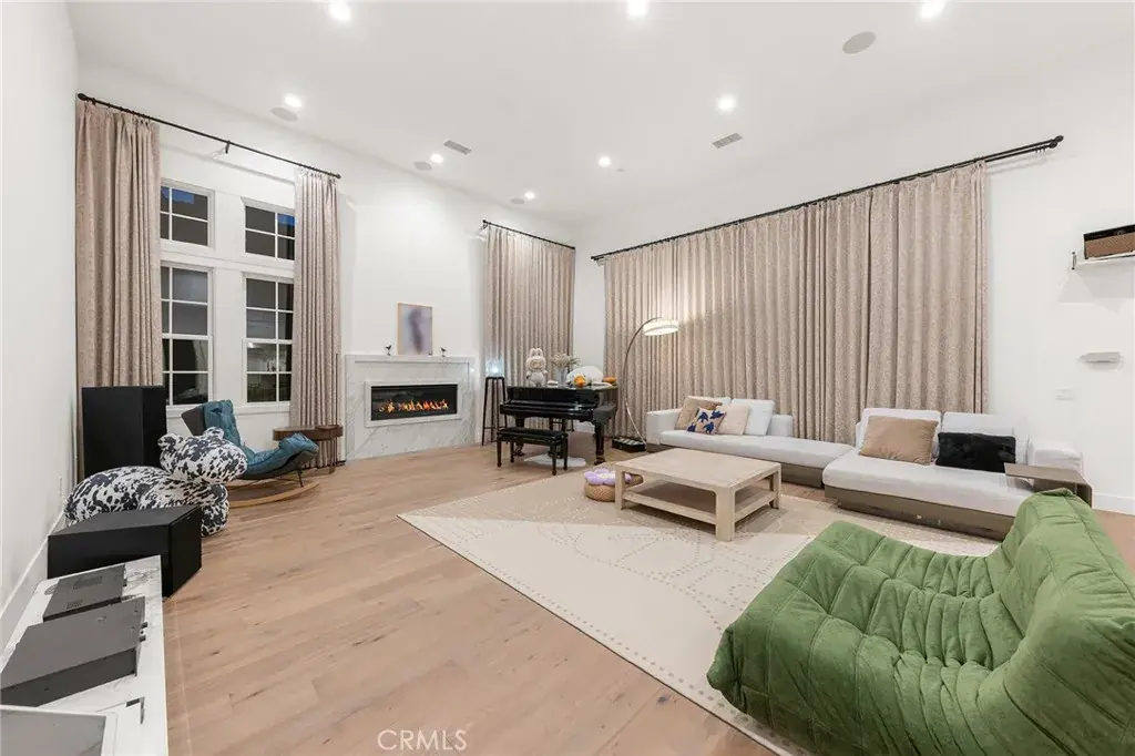 Upon entry, a dramatic 16-foot soaring ceiling in the grand living room creates an immediate sense of arrival. The expansive open space is filled with natural light and enhanced by wide-plank hardwood flooring, custom full-height drapery, recessed lighting, and a sleek fireplace—perfectly balancing warmth and sophistication. The open layout is thoughtfully designed for both grand-scale entertaining and effortless everyday living.