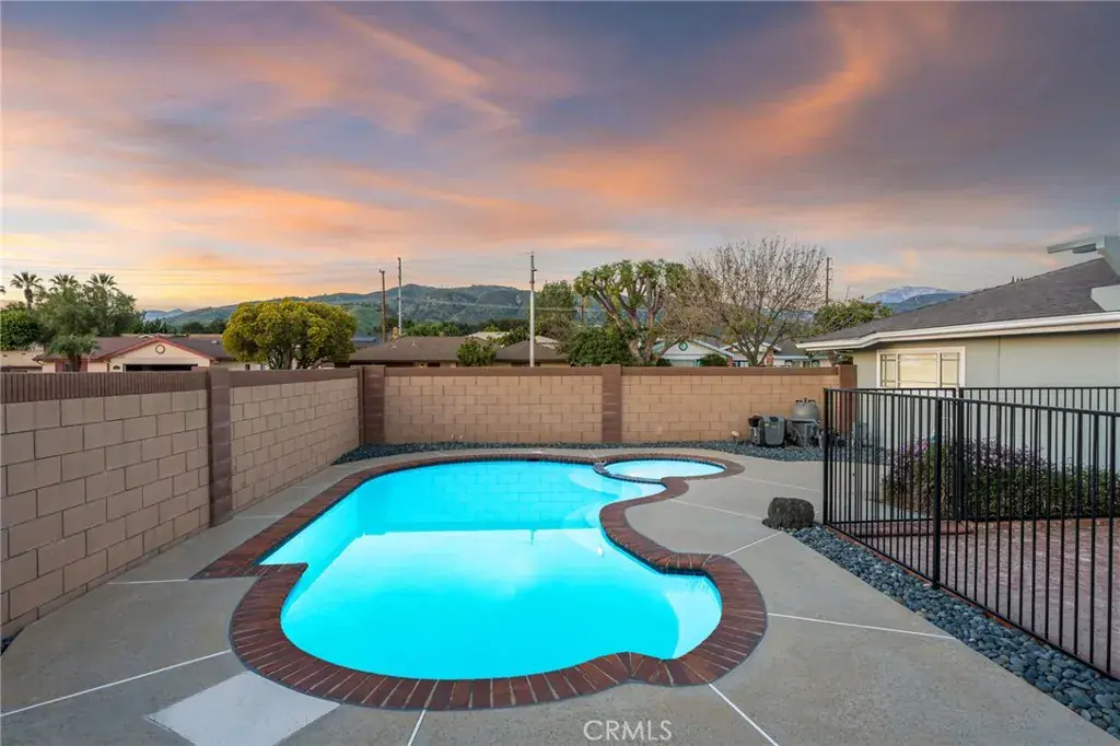 Single-story pool home situated on a desirable corner lot. The front yard features a manicured lawn, decorative river-rock garden with a Victorian lantern, and a herringbone brick planter leading to the covered front entry with a wood and glass front door . Inside, the home offers tiled flooring and a bright, open feel with LED recessed lighting throughout. The spacious kitchen features rich wood cabinetry, granite countertops, stainless steel appliances, and a peninsula with a gas cooktop and four-sided stainless steel vent hood. An adjacent dining area opens directly to the kitchen and includes custom built-ins and a window overlooking the front yard. The family room offers carpeted flooring, a fireplace with tiled surround and wood mantel, a built-in workstation, and a sliding glass door with views of the backyard and swimming pool. Down the hallway, ample built-in storage cabinetry provides added convenience and leads to the bedroom wing. The primary bedroom features carpeted flooring, custom built-ins, and an en-suite bathroom with tiled flooring, an expansive wood vanity, and a custom tiled shower with sliding glass enclosure. Two additional bedrooms are generously sized, one currently configured as a home office, along with an updated hall bathroom. The spacious garage includes a laundry center, bright lighting, and a pull-down ladder providing access to attic storage. The backyard is ideal for entertaining, offering a newly refinished pool and spa with brick coping, concrete decking, a large grass area, rock gardens, a covered patio with herringbone brick decking, and spacious side yards with lawn areas. Additional features include dual-pane windows throughout, brand-new interior and exterior paint, a two year old HVAC system, LED lighting, and a new water heater.