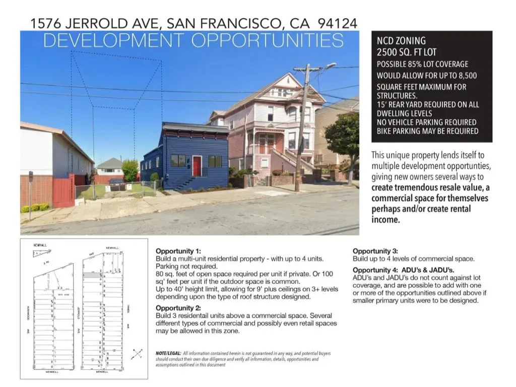 1574 and 1576 Jerrold Ave are being sold together as one purchase and include two separate parcels with individual APNs. The property consists of a move-in-ready single-family home and an adjacent vacant lot, offering a combined approximately 4,995 sq ft of land. The residence at 1574 Jerrold Ave is a 3-bedroom, 1-bath home with approximately 1,125 sq ft of living space. The home has been updated with new flooring and appliances and Section 1 clearance is scheduled to be completed. The property retains classic San Francisco character while providing comfortable living space. The adjacent parcel at 1576 Jerrold Ave is a vacant lot included in the sale. The additional parcel provides potential options for expansion, additional parking, or future development possibilities. Located in San Franciscos Bayview District with access to transportation, local amenities, and major roadways. Buyer to independently verify zoning, development potential, and all building possibilities with the City of San Francisco.