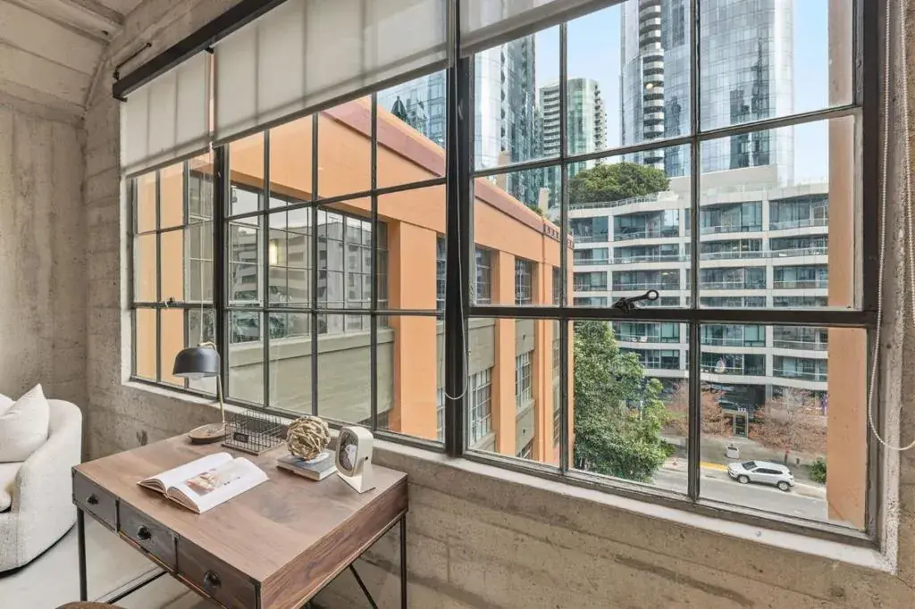 Industrial heritage meets modern luxury in this 954 sq ft 1BD/1BA San Francisco condominium. Blending bold historic character with refined Art Deco accents, the unit features 11-foot ceilings, polished cement floors with radiant heating, and northeast-facing warehouse windows framing views of sparkling modern high-rises. The bright open-concept living area creates an inspiring environment perfect for both relaxation and productivity. A sleek stainless steel galley kitchen anchors the space, with an adjacent laundry room. The generously-sized bedroom and bathroom offer comfort while maintaining the airy, architectural feel; an ideal setting for today’s work-from-home lifestyle. Located in close proximity to the Embarcadero waterfront, the Ferry Building, the Financial District, sports venues including Chase Center and Oracle Park, upscale shopping, celebrated dining, and mass transit options, the best of the city is right at your doorstep. Amenities include high-speed elevators, attended lobby, secure parking, and a rooftop terrace perfect for relaxing or working against the backdrop of the skyline. Embrace this rare opportunity to own a sophisticated urban sanctuary in one of the city’s most historically significant condominium conversions, The Embarcadero Lofts.