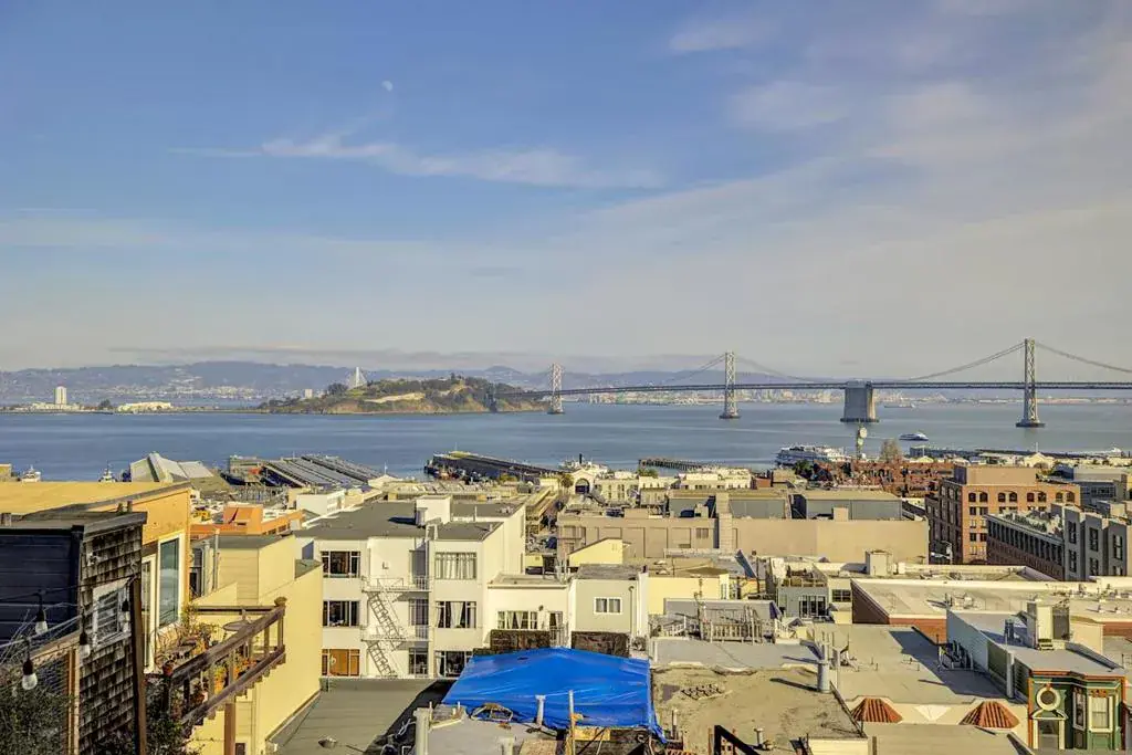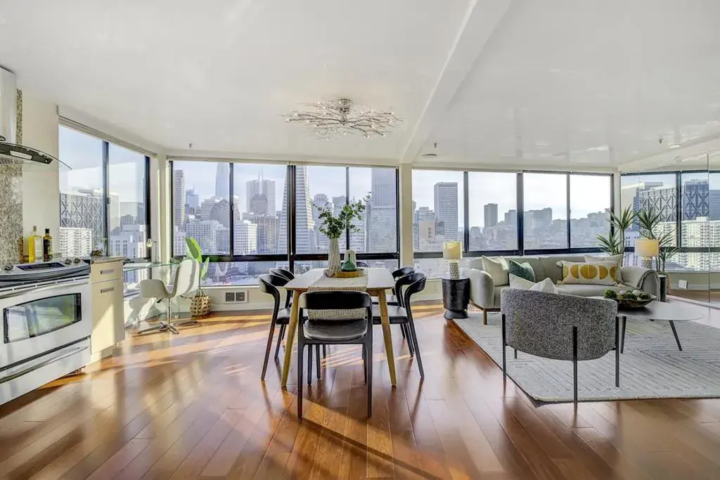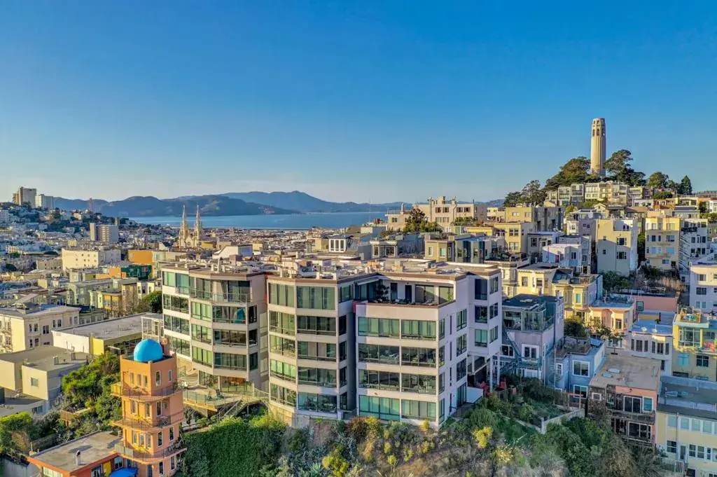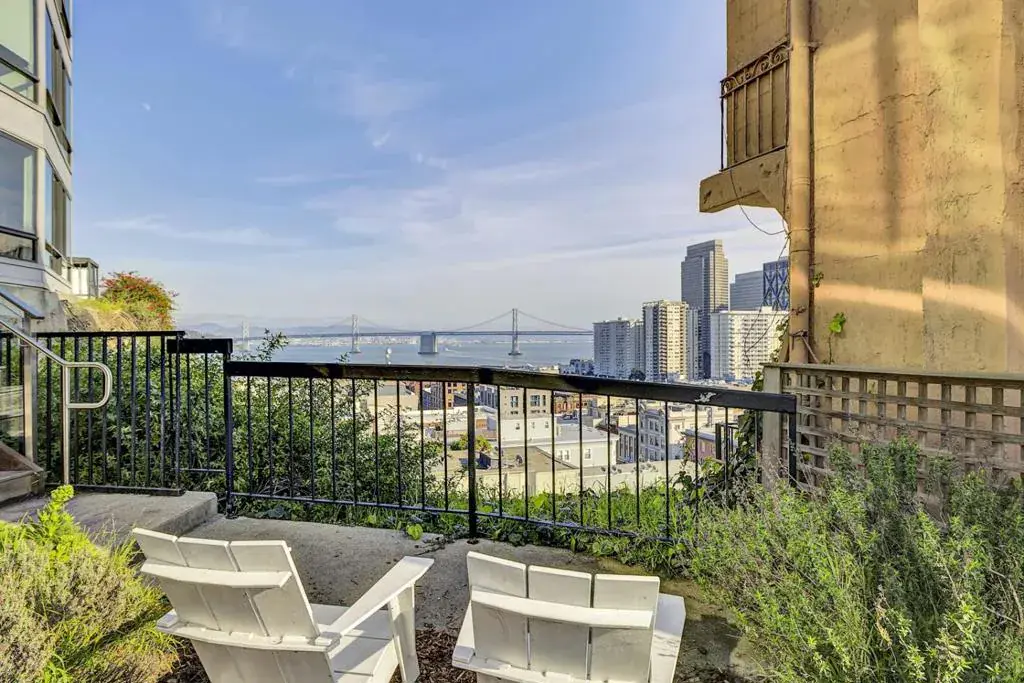 Perched high above the city at 455 Vallejo Street #403, this beautifully renovated condominium offers an extraordinary San Francisco living experience, defined by breathtaking south- and east-facing views that stretch across the city and Bay. The living space is framed by expansive windows that showcase iconic city scenery from sunrise to sunset. Interior finishes include venetian plaster walls, granite countertops, stainless steel appliances, and hardwood floors, creating a clean, elevated aesthetic that feels timeless and sophisticated. The spacious bedroom easily accommodates a king-size bed and additional furnishings, offering a serene retreat above the energy of the city. Residents enjoy the convenience of deeded and independent garage parking and dedicated storage. Building amenities include two shared entertaining decks with panoramic Bay Bridge and skyline views, a barbecue area, a community room, guest parking with EV charging, and beautifully maintained common spaces. Set at the quiet crest of Vallejo Street near the historic Vallejo Steps, this prime location places you moments from North Beach, Jackson Square, the Financial District, and the Embarcadero, offering the perfect balance of peaceful privacy and vibrant city living.