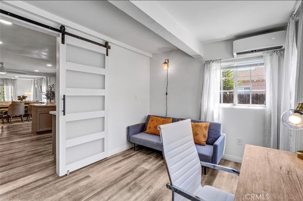 The open-concept living room and dining area are filled with natural light, seamlessly connecting to an upgraded kitchen with quartz countertops, ample cabinet storage, and a breakfast bar—ideal for everyday living and entertaining.