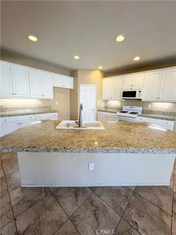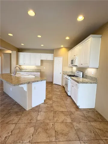 At the heart of the home, the GOURMET KITCHEN impresses with a striking GRANITE ISLAND, breakfast bar seating, a walk-in pantry, and an abundance of white cabinetry.