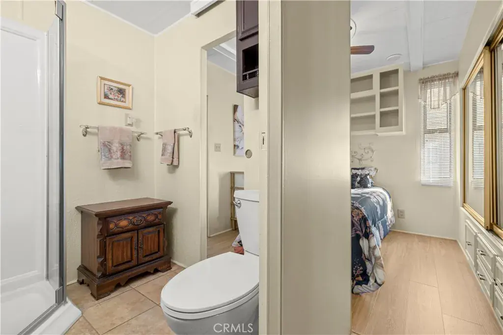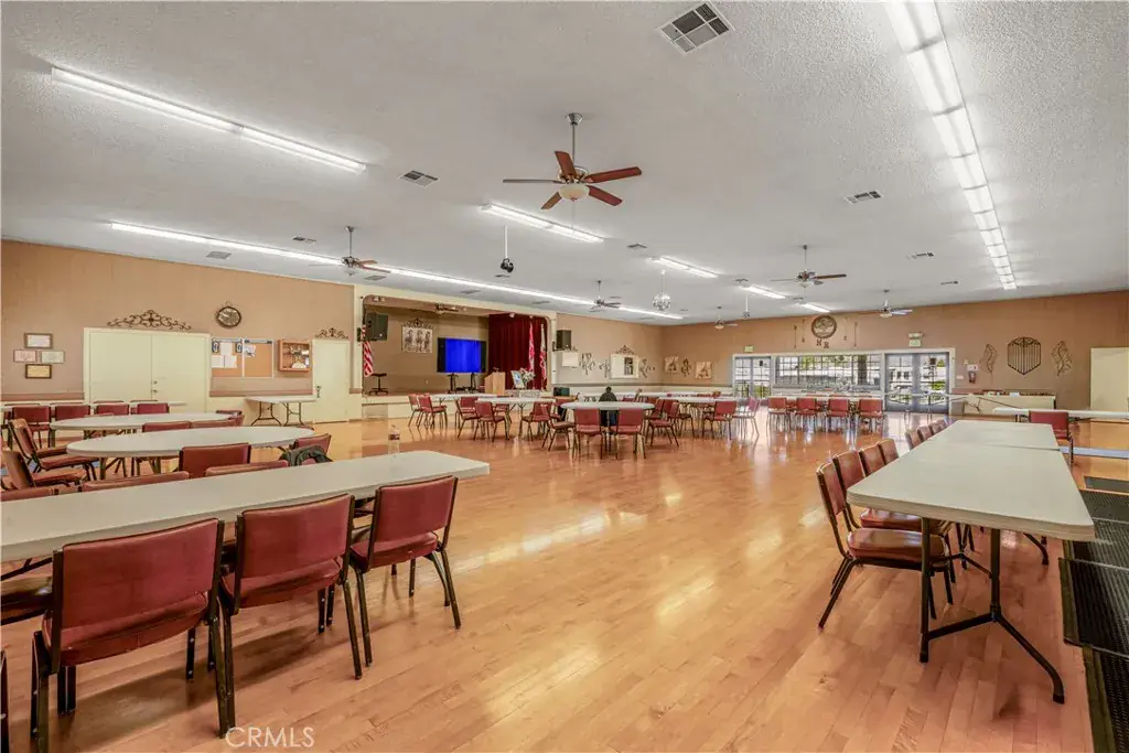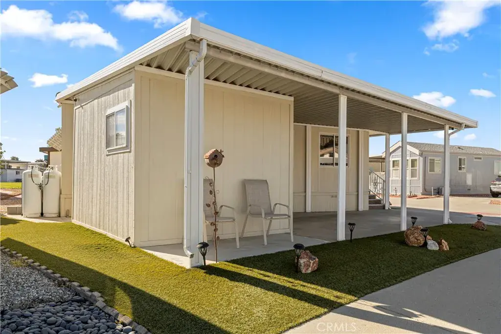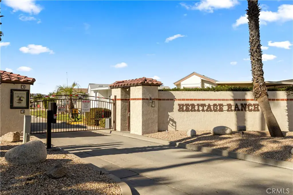 Welcome to Heritage Ranch, a gated 55+ active senior community offering comfort, convenience, and resort-style amenities. This charming 1985 park model with a thoughtfully designed addition offers approximately 700 sq ft of well-utilized living space with stunning views of the San Jacinto Mountains. The upgraded kitchen features updated cabinetry, granite countertops, stainless steel appliances and sink, and a stylish tiled backsplash, complemented by hardwood and tile flooring throughout and ceiling fans for year-round comfort. The spacious bathroom includes an enlarged corner shower, and the home is equipped with a tankless water heater. Additional highlights include an indoor laundry room with storage, handicap ramp access, and an oversized storage shed providing ample space for tools, hobbies, or seasonal items. Washer, dryer, and furniture are included, making this home truly move-in ready. Heritage Ranch offers amenities galore, including a clubhouse, gym, indoor spa, outdoor pool, recreation area, and library, creating an ideal setting for an active and social lifestyle. Enjoy low taxes and a low HOA of $218/month, which includes water, sewer, trash, basic cable, and internet. Conveniently located near shopping and medical offices, this home is the perfect blend of comfort, accessibility, and community.