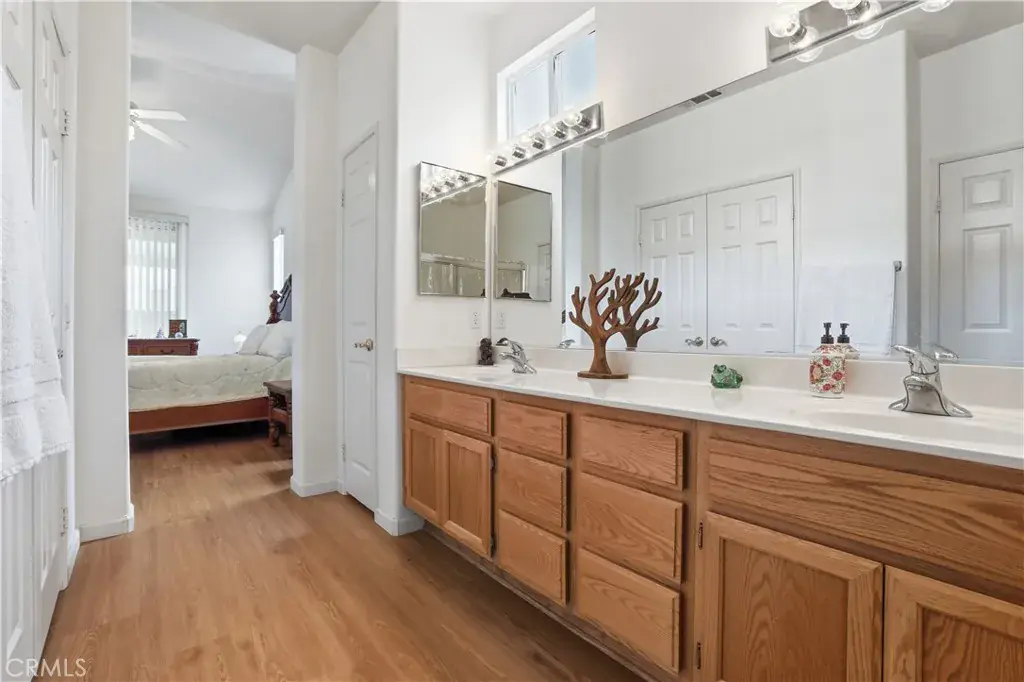 Welcome to effortless living at The Estates of San Jacinto, a premier gated community for those 55 and better! This updated charming 2-bedroom, 2-bathroom home offers an exceptional chance to embrace a vibrant retirement lifestyle in this community offering the most affordable opportunity. Enter inside the home and be greeted by the vaulted ceilings, and abundant natural light, an open and airy floor plan, seamlessly connecting the living room, dining area, and kitchen creating a bright and cheerful atmosphere. Imagine enjoying meals with a view of your private backyard, enhanced by the beautiful upgraded laminated wood flooring, custom paint, gleaming white kitchen quartz countertops, breakfast bar, and dedicated dining space. The primary bedroom, a true retreat, features an en-suite bathroom and sliding glass doors leading directly to the tranquil backyard where you can relax or entertain on the covered patio, shaded by an aluminum patio cover. Privacy is paramount with the second bedroom located on the opposite side of the home, complete with full bathroom and tub/shower combo. Beyond the home’s inviting interior, you’ll discover a wealth of community amenities. Enjoy miles of safe walking paths, a clubhouse with a kitchen, game room, and library, and a sparkling pool, spa, and BBQ area right outside your back gate! Low taxes and HOA dues ensure worry-free living, with the association maintaining front lawns for a consistently manicured appearance. A conveniently located laundry room with easy direct access to the garage. Enjoy unparalleled convenience with shopping, movies, post office, and entertaining all just a short distance away. Schedule your showing today and discover the perfect place to call home at The Estates of San Jacinto.