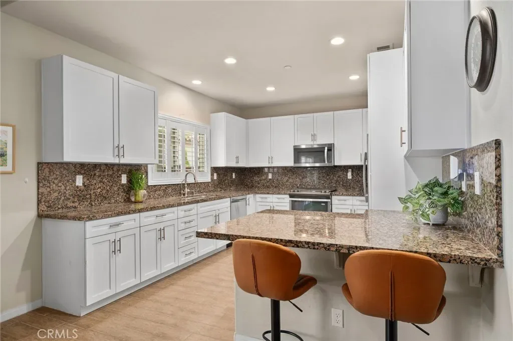 Further into the home, a versatile dining area awaits—featuring a ceiling fan and a cozy fireplace—perfect for entertaining or easily used as a second living space. The spacious kitchen boasts granite countertops, a peninsula for additional seating, a full granite backsplash, and newer cabinetry, offering both style and practicality.